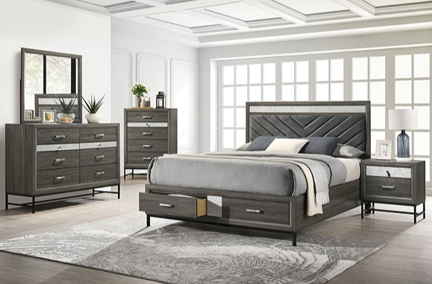 Contemporary Gray Fabric, Metal, Paper, Engineered Wood Footboard Storage Drawers Padded Headboard Crystal-like Acrylic Accents and Drawer Handles Metal Leg
