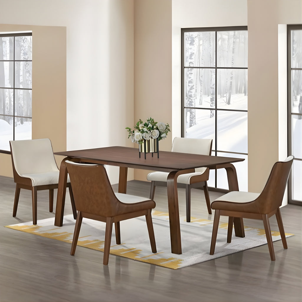 Table + 6 Chairs Mid-Century Modern Walnut Fabric, Solid Wood, Engineered Wood, Wood Veneer, Others Curved Panel Back Chair Padded... Table + 6 Chairs Mid-Century Modern Walnut Fabric, Solid Wood, Engineered Wood, Wood Veneer, Others Curved Panel Back Chair Padded Seats View more