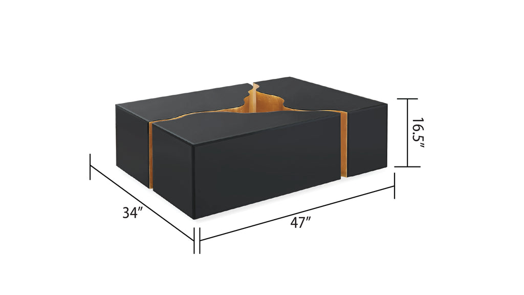 7225-MAJESTIC-COFFEE TABLE-BLACK This striking coffee table features a bold, geometric silhouette with a dramatic split down the center, creating a... 7225-MAJESTIC-COFFEE TABLE-BLACK This striking coffee table features a bold, geometric silhouette with a dramatic split down the center, creating a dynamic and sculptural effect. Finished in a sleek matte black, the table's interior reveals a contrasting metallic gold accent, adding depth and a luxurious touch. The asymmetrical crack-like opening serves as both a design statement and a functional space for storage or decorative display. Perfect for contemporary and avant-garde interiors, this coffee table blends artful aesthetics with modern sophistication. View more