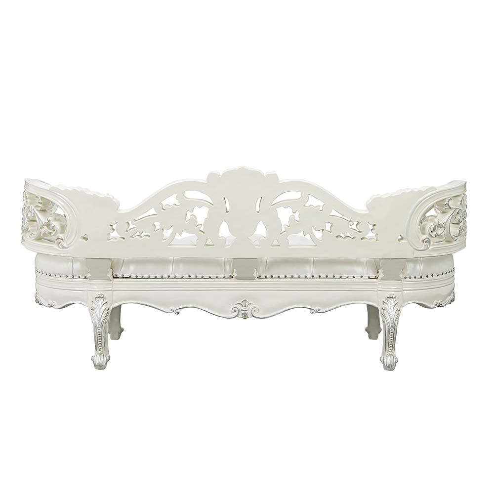 Bringing a modern approach to the classic ornate Rococo style, the Adara bed blends in contemporary touches with traditional design... Bringing a modern approach to the classic ornate Rococo style, the Adara bed blends in contemporary touches with traditional design details. The synthetic leather adds a fresh approach to the intricately embellished bed. The antique white is embellished with light gold hand brushed details to make the floral motifs pop. This is one statement piece that will impress everyone. View more