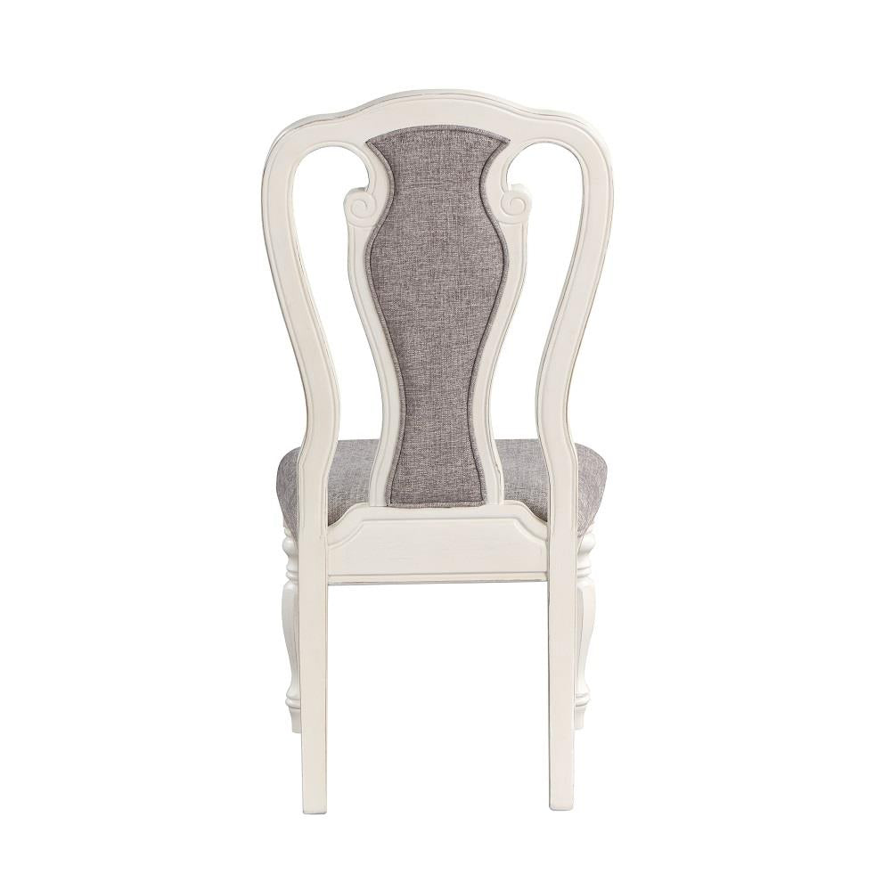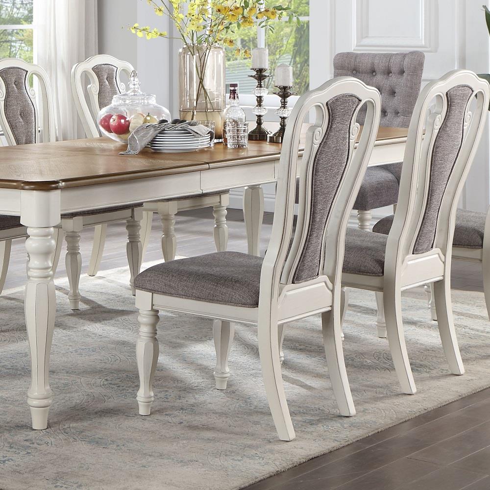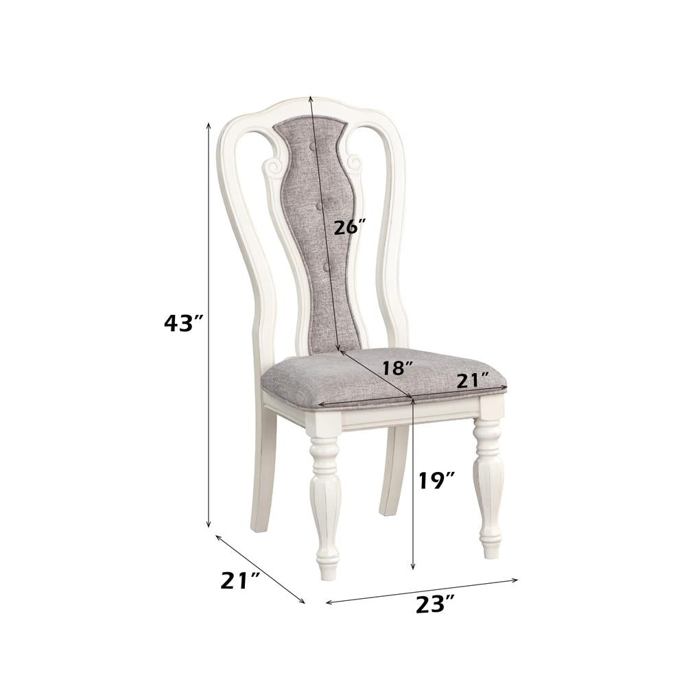 Rectangular Legs TableTwoTone Dining: Oak Top & Antique White BaseExtension Top: 2 Removable Leaves (18")Wooden Top & ApronPadded Seat & Back Cushion: Gray FabricWooden Turned Legs(Front)Server w/2 Drawers & 2 DoorsTable Available in Two Sizes