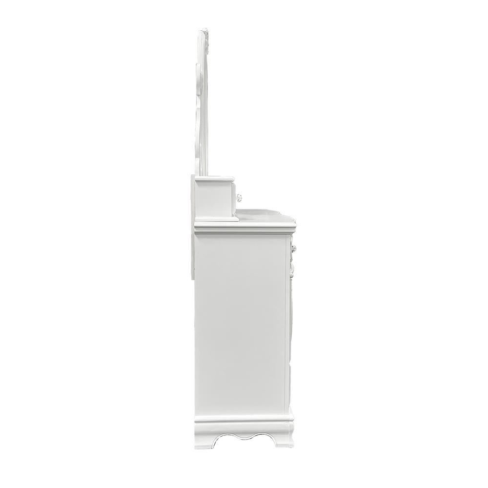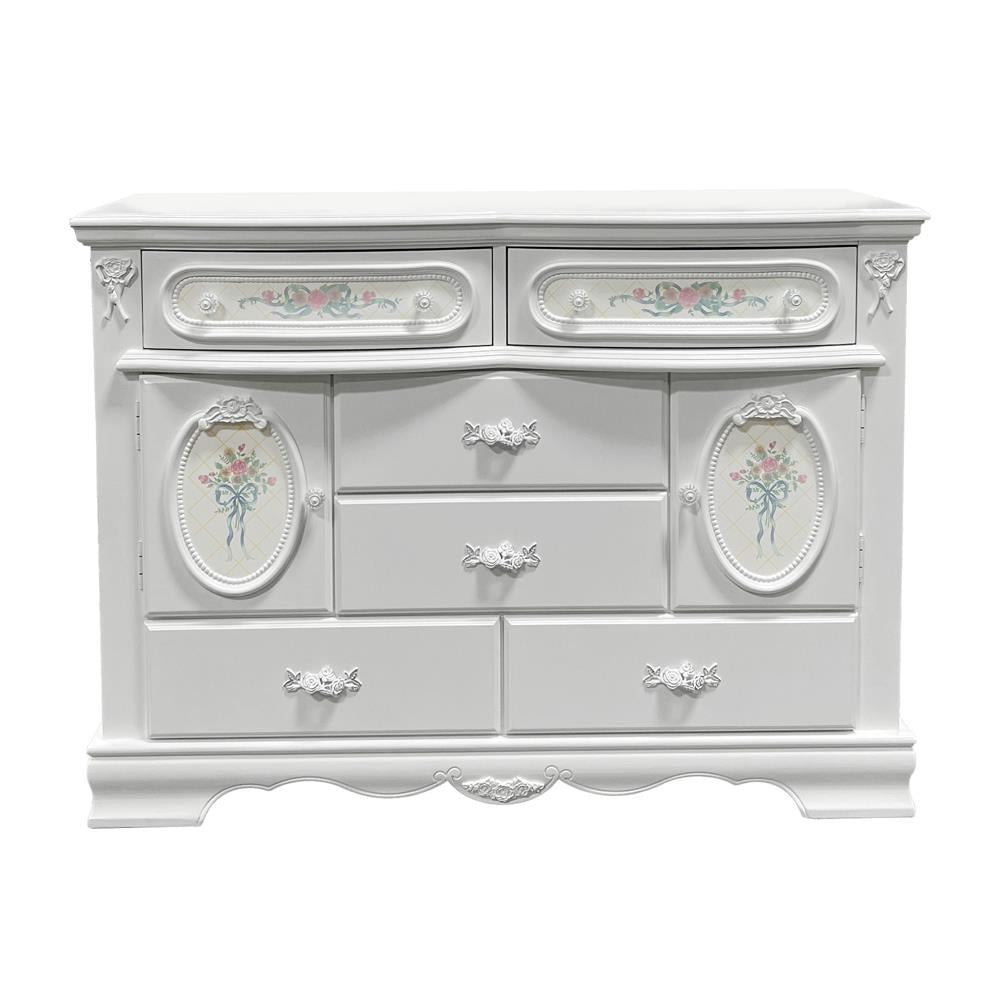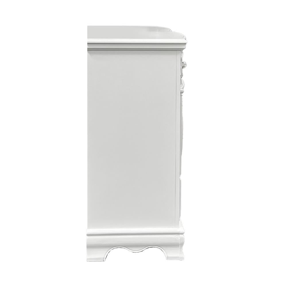 6 Drawer & 2 Doors (No Shelves Inside)Drawer: Wooden Center Drawer Glide, Dovetail Included, Felt-Lined Top Drawer, Hardware: Crystal like Knob (2 Top Drawers), Single Rossete Handle (4 Bottom Drawer)ConstructionWooden Case-Frame: Bow Top ShapeWood Backet LegsRossette InlaysAnti-Tipping KIT IncludedASTM F2057 - 17 & ASTM F3096 - 14 Compliant (YES)