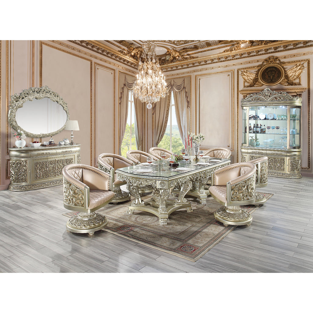 Opulent and magnificent the Sornia dining table will be the focal point of any dining room and is sure to... Opulent and magnificent the Sornia dining table will be the focal point of any dining room and is sure to wow guests. The clear glass tabletop allows for the fine details to be enjoyed while dining and will be the topic of conversation throughout the night. The large size is excellent for hosting larger gatherings. View more