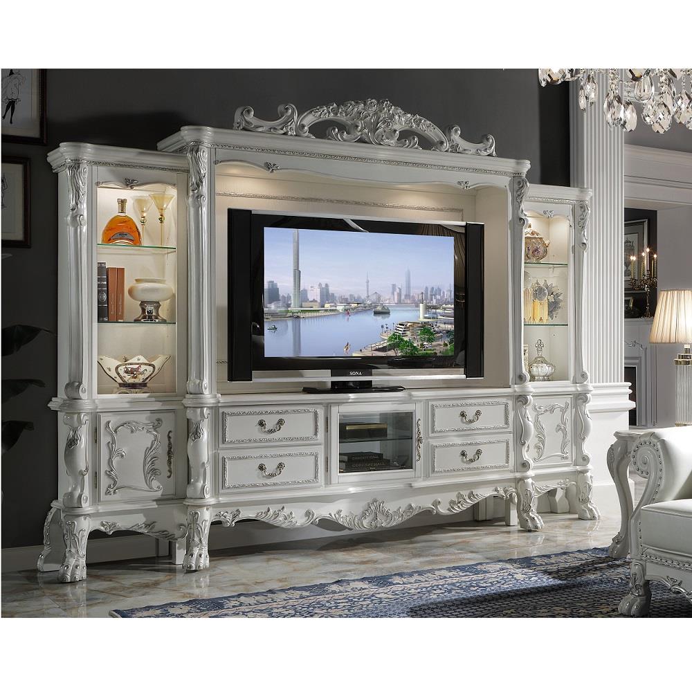 Exclusive DesignEntertainment CenterIncludes: 2 Side Piers & Center HutchStorage: Pier 3 Open Compartments and 1 Wooden DoorTouch Light FunctionMax Size Recommended: 70" Flat Panel TVOversized Scrolled Moldings & Claw Legs with Antique Hand Brushed FinishSold Separately: TV Stand