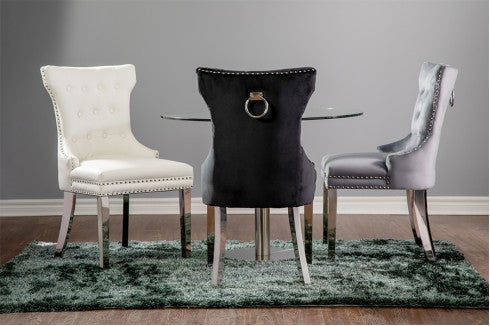 Silver Stainless Steel Legs Upholstered with Buttons & Nail Heads Available in Grey Velvet, Black Velvet or White Leatherette21” x... Silver Stainless Steel Legs Upholstered with Buttons & Nail Heads Available in Grey Velvet, Black Velvet or White Leatherette21” x 20” x 37” HSeat Height – 19”  44-018 View more