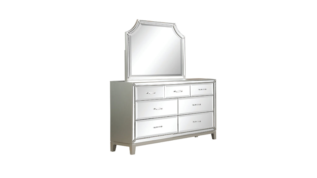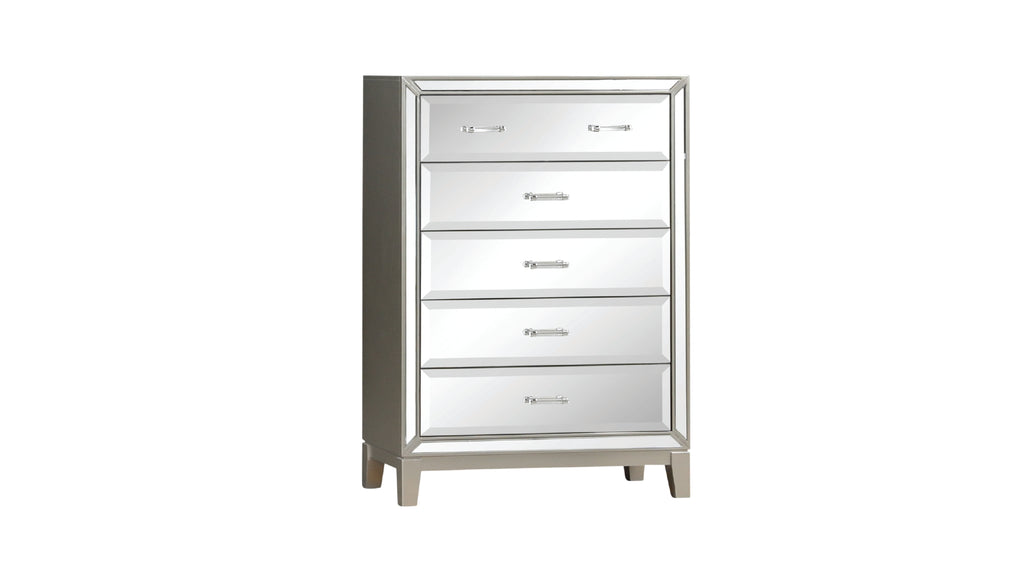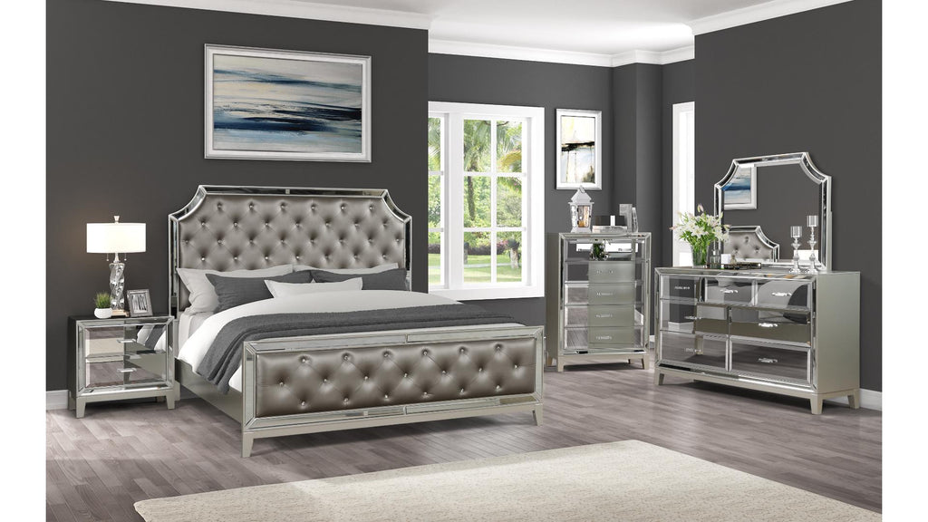Add a touch of glamour and sophistication to your bedroom with this stunning 5-piece mirrored bedroom set, featuring a tufted... Add a touch of glamour and sophistication to your bedroom with this stunning 5-piece mirrored bedroom set, featuring a tufted silver velvet bed, dresser, mirror, nightstand, and chest. The luxurious padded headboard and footboard, adorned with deep diamond tufting and mirror accents, create an opulent statement. Designed for both style and functionality, the set includes spacious storage drawers with crystal knob hardware, offering a blend of elegance and practicality. With its sleek mirrored surfaces and high-end craftsmanship, this collection transforms your space into a modern luxury retreat. 1.Durable Construction2. Tufted Silver Velvet Headboard & Footboard3.Mirror Trim Accents4.Spacious Storage Drawers5.Crystal Knob Hardware View more