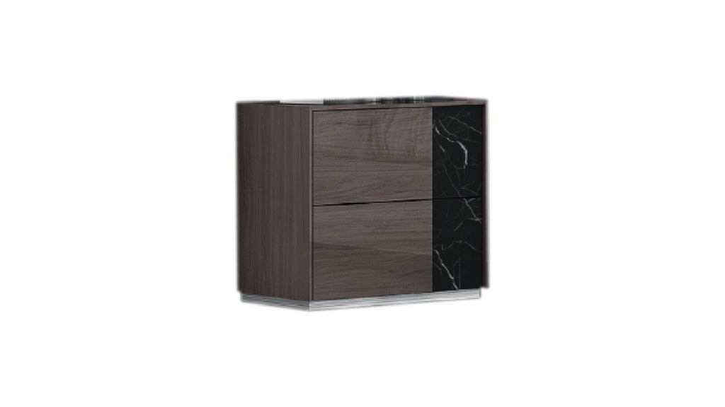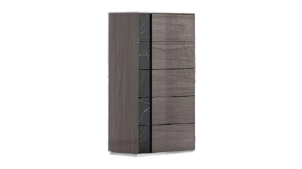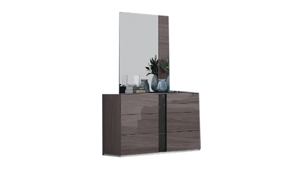 Bring sleek sophistication to your bedroom with this modern 5-piece bedroom set, designed for a refined and contemporary lifestyle. Featuring... Bring sleek sophistication to your bedroom with this modern 5-piece bedroom set, designed for a refined and contemporary lifestyle. Featuring a low-profile bed, dresser, mirror, nightstand, and chest, this set showcases a rich wood grain finish with striking black marble inlays for a bold yet understated look. The high-gloss surface and clean lines exude elegance, while soft-close drawers and spacious storage compartments ensure effortless organization. Crafted with premium materials for durability, this collection blends minimalist design with luxurious accents, making it the perfect choice for those who appreciate modern refinement. 1.Sleek Wood Finish with Black Marble Accents2.Lacquer Finish - Adds a polished and sophisticated touch.3.Soft-Close Storage Drawers.4.Minimalist Design with Clean Lines.5.Premium Quality Construction. View more