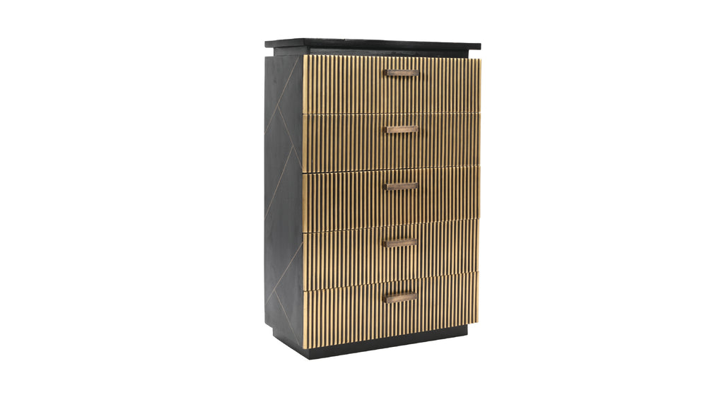 Elevate your bedroom with this luxurious solid wood bedroom set, a statement of sophistication and craftsmanship. Featuring sleek black and... Elevate your bedroom with this luxurious solid wood bedroom set, a statement of sophistication and craftsmanship. Featuring sleek black and gold accents, this set exudes contemporary elegance while ensuring durability and strength. The 5-piece set includes a Queen/King bed, dresser, mirror, nightstand, and chest, all crafted from premium solid wood for long-lasting quality. The upholstered headboard with vertical paneling and gold inlay detailing adds a refined, modern touch, making this collection perfect for those who appreciate style and substance. 1.5-Piece Set - Includes a bed, dresser, mirror, nightstand, and chest.2.Solid Wood Construction3.Upholstered Headboard4.Gold Inlay Detailing View more