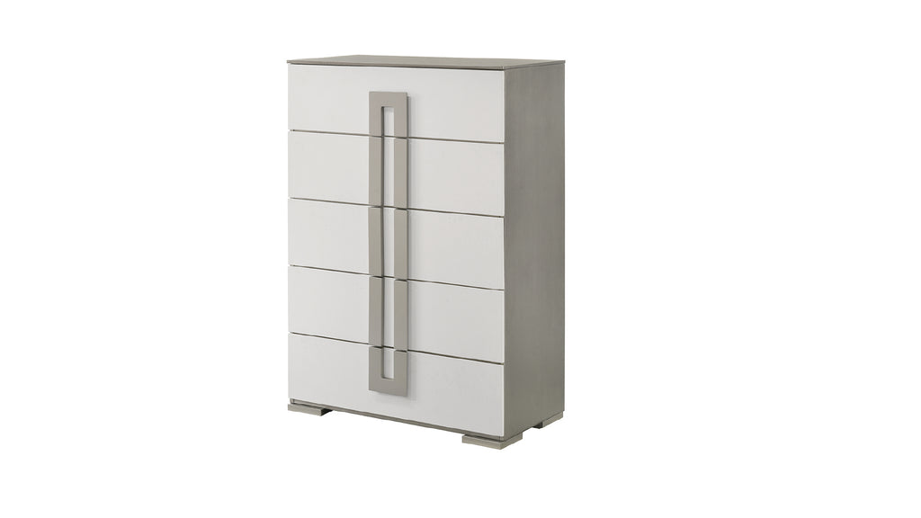 Enhance your bedroom with this contemporary bedroom set, featuring a sleek high-gloss white lacquer finish and a padded LED-lit headboard.... Enhance your bedroom with this contemporary bedroom set, featuring a sleek high-gloss white lacquer finish and a padded LED-lit headboard. Designed with clean lines and a minimalist aesthetic, this set adds a refined and modern touch to any space. The five-piece set includes a bed, dresser, mirror, chest, and nightstand, all crafted with soft-close drawers and elegant metal handles for both style and functionality. Built with durable materials, this set offers a long-lasting and sophisticated upgrade to your bedroom. High-gloss white lacquer finish for a sleek, modern appealLED-lit upholstered headboard for ambient lightingSoft-close drawers for smooth and quiet operationFive-piece set includes bed, dresser, mirror, chest, and nightstandDurable construction ensures long-lasting useElegant metal handles for a refined, contemporary touch View more
