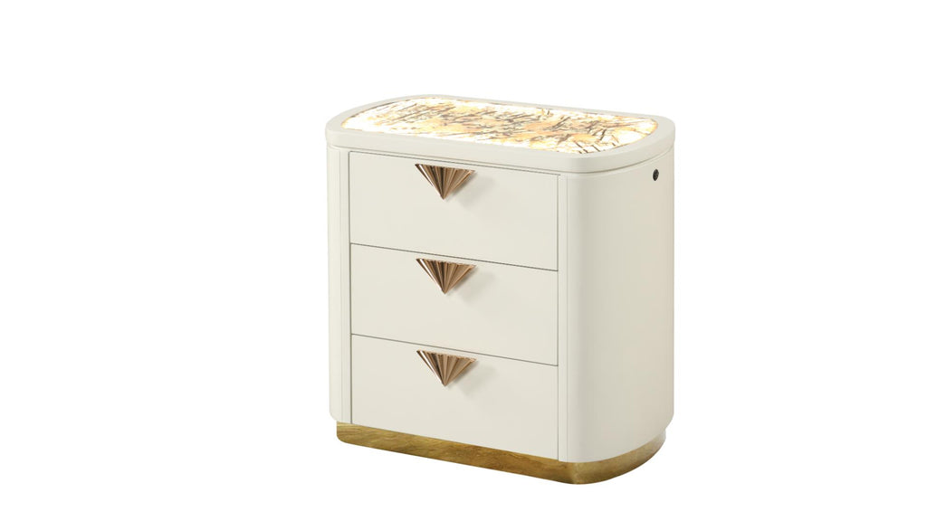 This contemporary bedroom set blends luxurious design with modern functionality, featuring an elegant cream lacquer finish accented with gold details.... This contemporary bedroom set blends luxurious design with modern functionality, featuring an elegant cream lacquer finish accented with gold details. The bed showcases a plush, upholstered headboard with integrated LED lighting and decorative side panels, adding sophistication to any space. The footboard offers built-in storage, while the case goods, including the dresser, chest, and nightstand, provide ample space to keep your bedroom organized. A statement mirror with matching LED accents completes the set, making it a perfect addition to any upscale bedroom. High-quality lacquer finish in cream with gold accentsHeadboard: Upholstered with LED lighting and decorative side panelsStorage: Built-in storage drawers in the footboard for added functionalityCase Goods: Dresser, chest, and nightstand with spacious soft-closing drawers View more