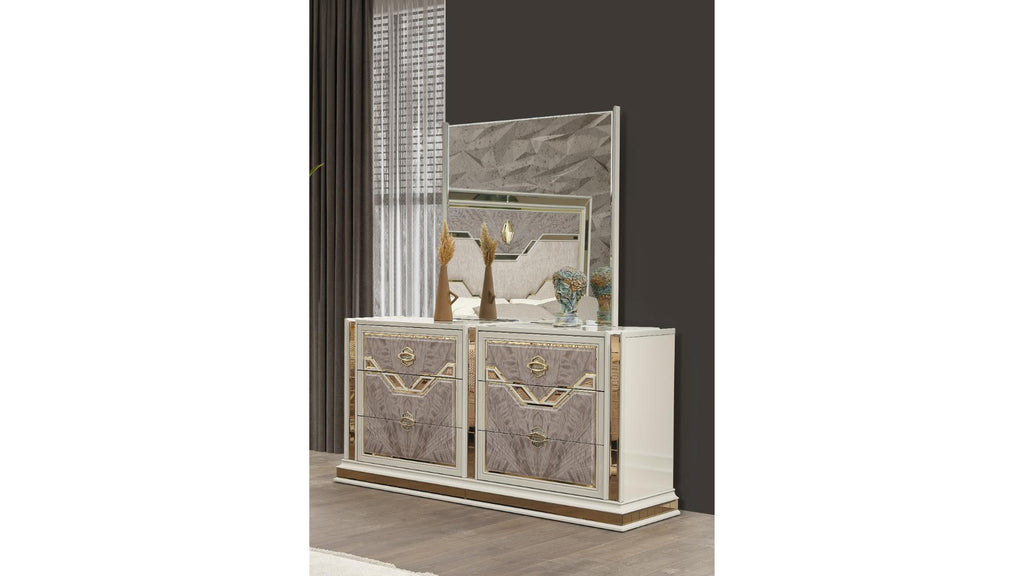 Enhance your bedroom with this elegant and modern bedroom set, designed to bring sophistication and functionality. The bed features a... Enhance your bedroom with this elegant and modern bedroom set, designed to bring sophistication and functionality. The bed features a stunning upholstered headboard with integrated LED lighting, framed by gold accents for a luxurious touch. The case goods, including a dresser, mirror, nightstand, and chest, showcase unique textured drawer fronts and gold-finished handles, adding a distinctive charm. Crafted with premium materials, this set offers durability and ample storage, making it a perfect choice for contemporary interiors. Soft fabric paneling with integrated LED lighting for a modern touch.Gold Accent DetailsUnique patterning on the dresser, chest, and nightstand for added character. View more