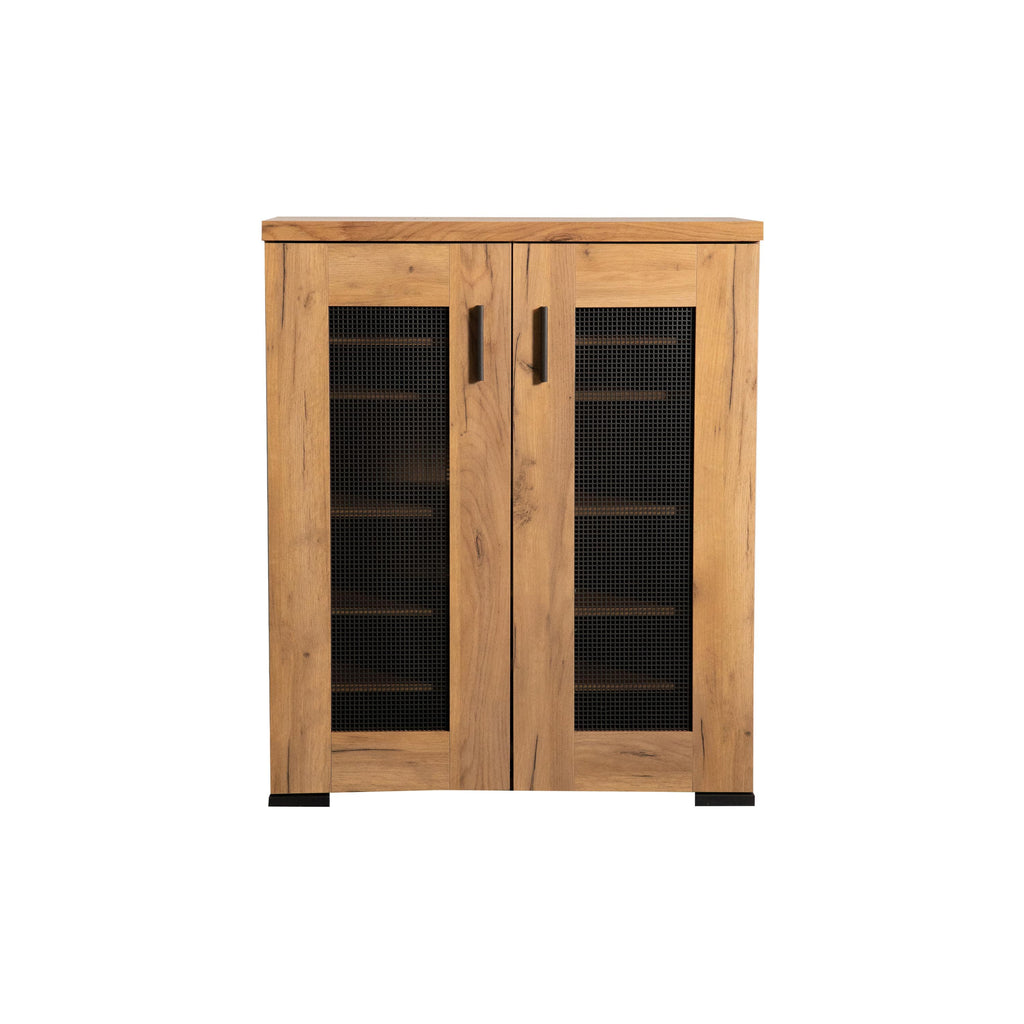 Organize your shoe collection inside this two-door rustic style shoe cabinet. The golden oak finish creates an attractive appeal in... Organize your shoe collection inside this two-door rustic style shoe cabinet. The golden oak finish creates an attractive appeal in entryways and mudrooms. The gunmetal mesh door panels make for a striking contrast. Sleek bar pulls match the block style feet. Use this piece for your shoes or general storage needs. View more