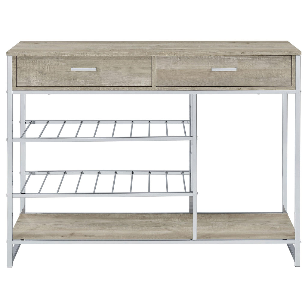 • Gray finish wood products construction with minimalist metal framing for an all-in-one bar cabinet with two drawers and two slat shelves