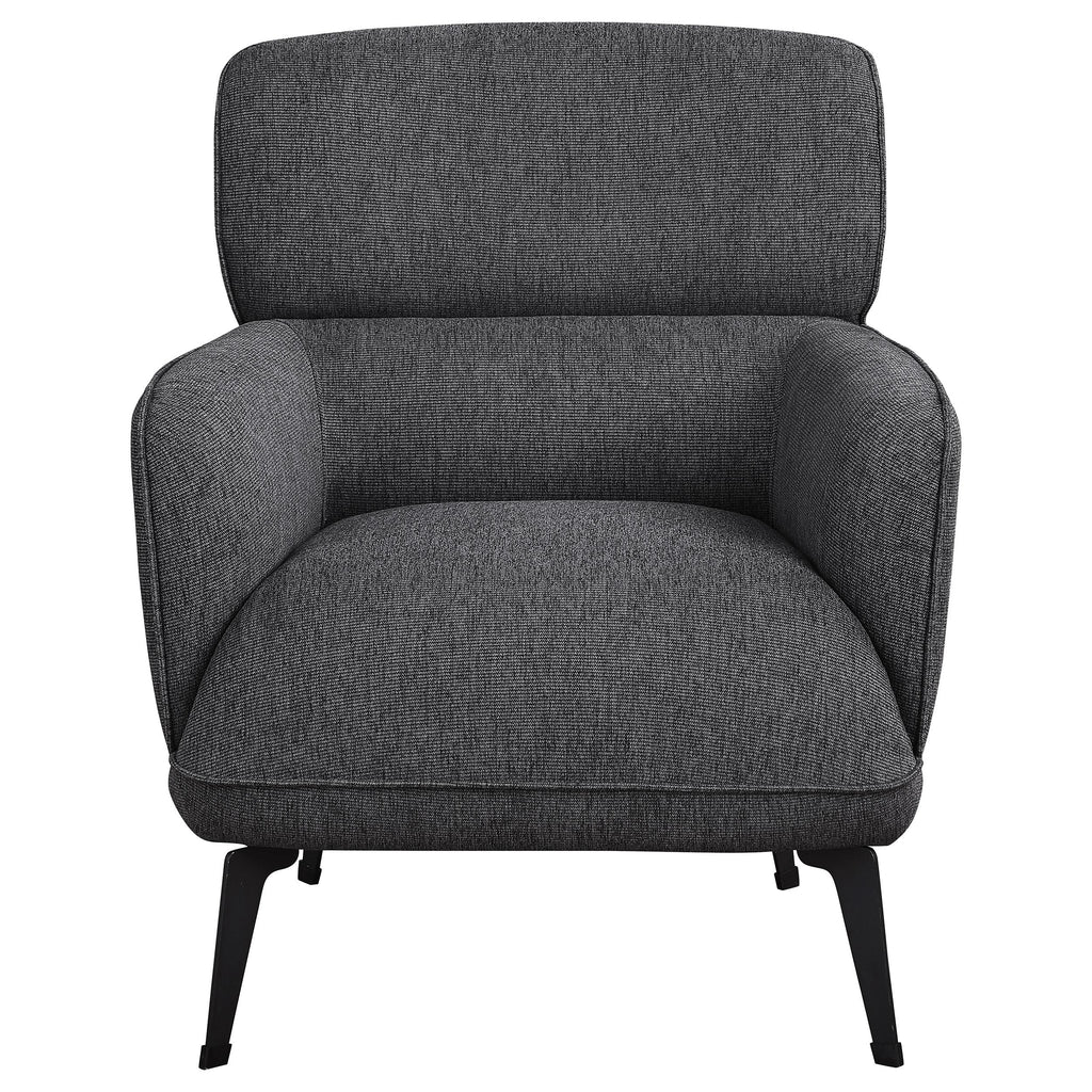 • Chic accent chair with modern and transitional style elements, upholstered in luxurious fabric, rounded track arms, deep non-removable seat cushion, and black metal legs