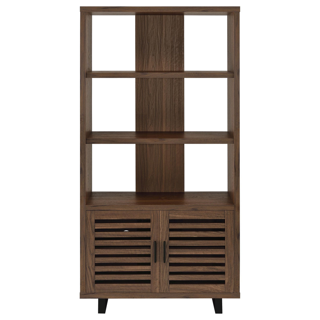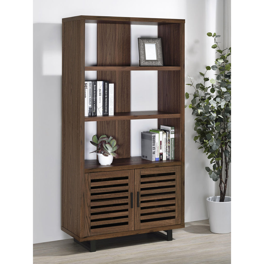 • Bookcase stands on open frame legs with a black finish and matching vertical bar pulls on doors
