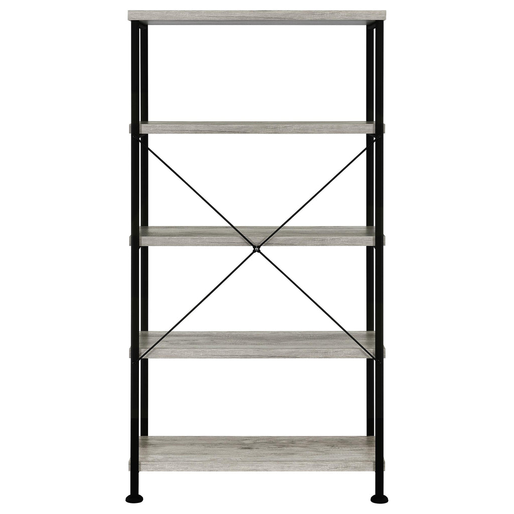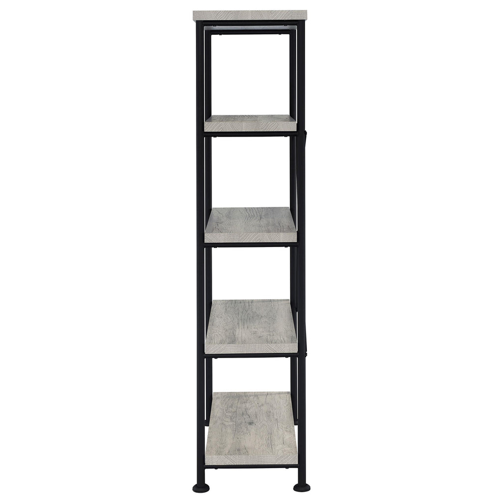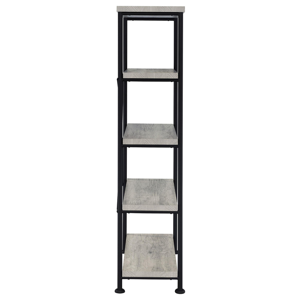 • Industrial bookcase in grey driftwood with black metal frame boasts clean lines for your modern decor