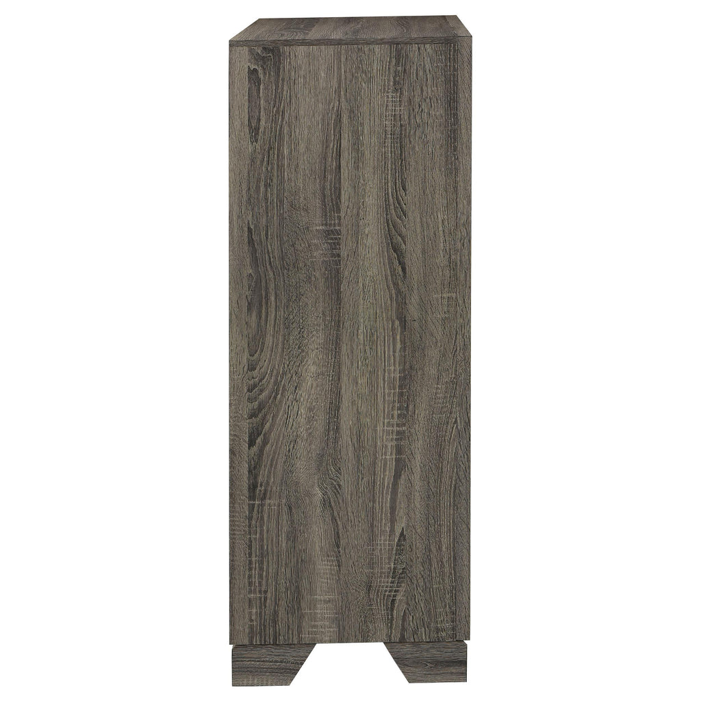 • A brown oak wood grain finish is complemented with metal bar handles that add a touch of contrast
