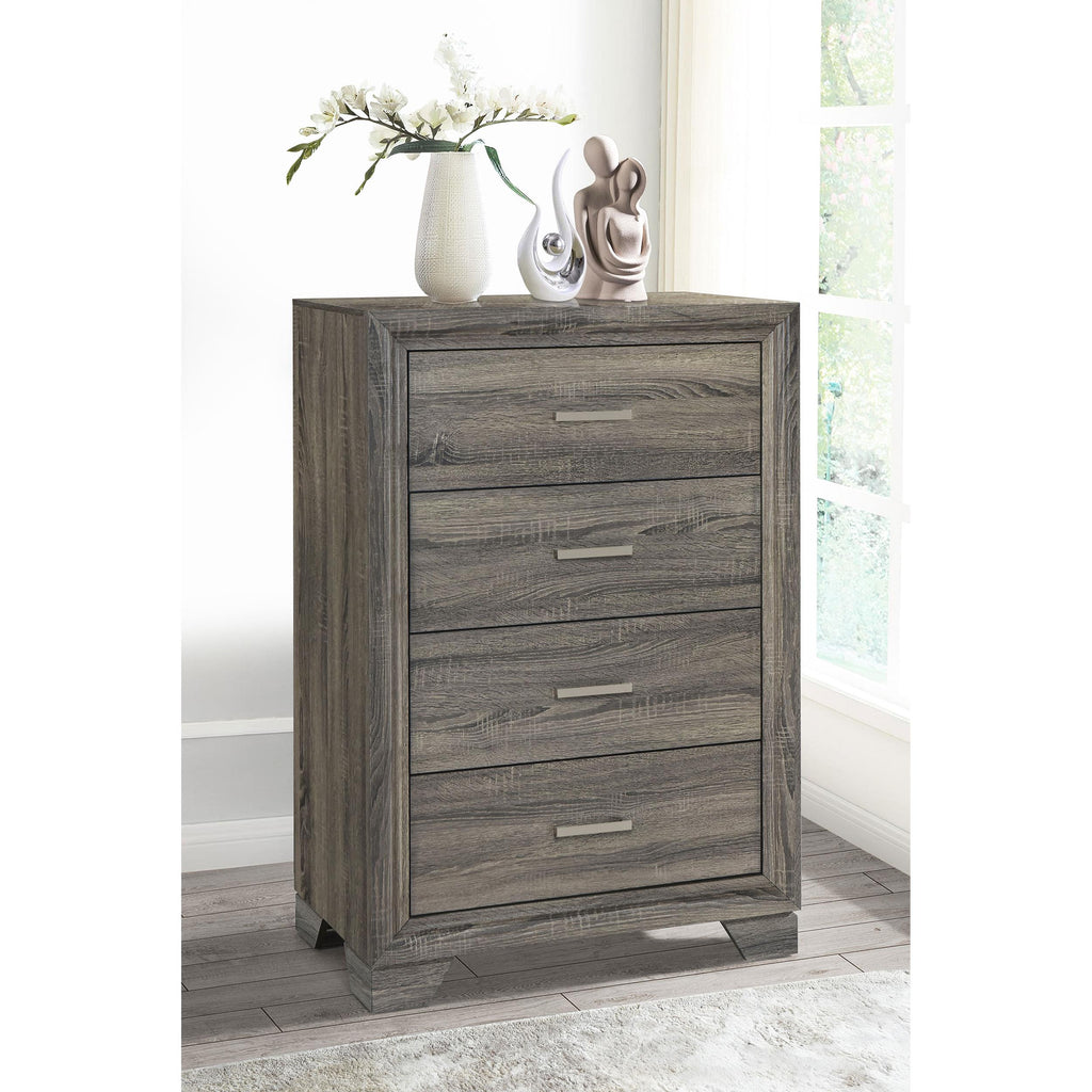 • Crisp style enhances the clean lines of a transitional four-drawer chest with a compact footprint