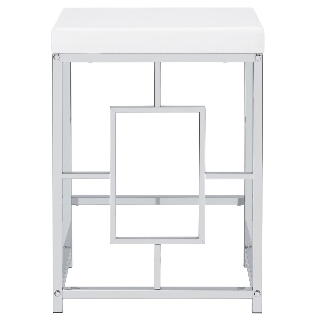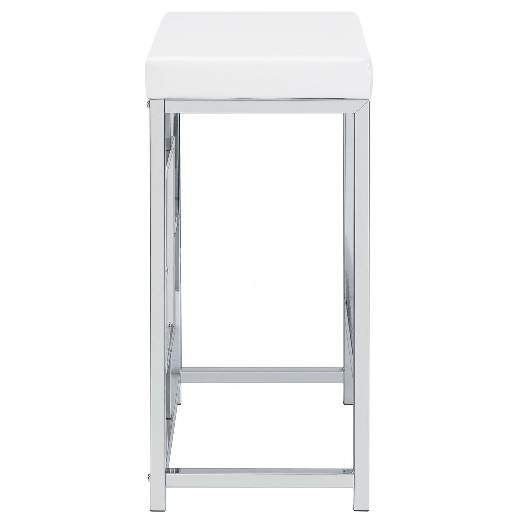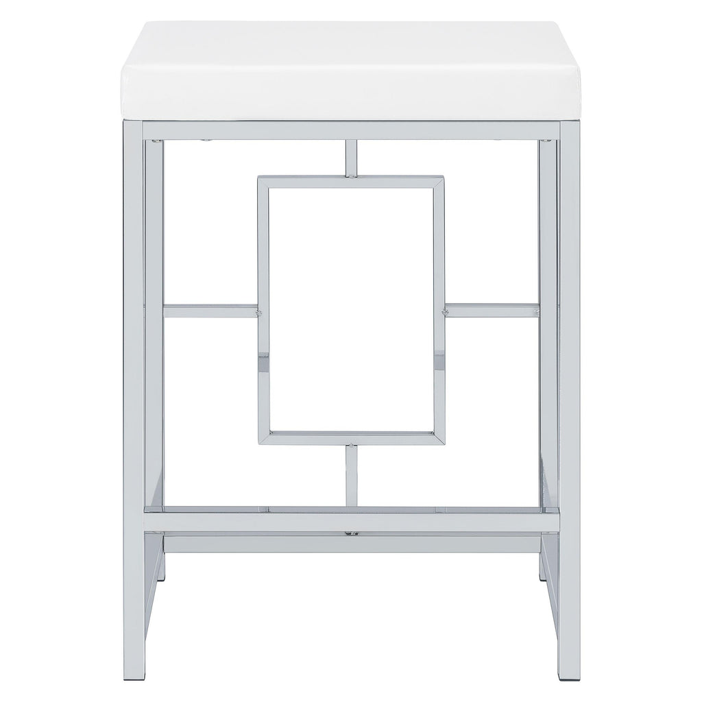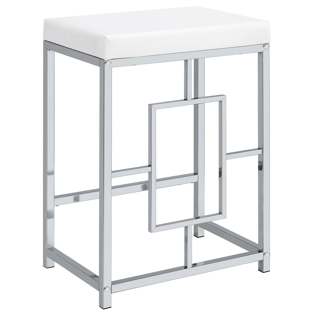 • Two stools are backless, with silver finish bases and faux leather upholstery over foam padding