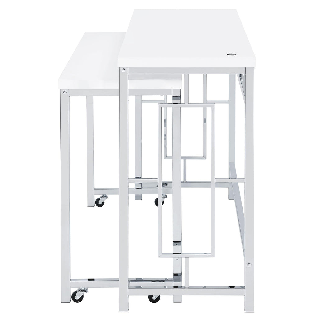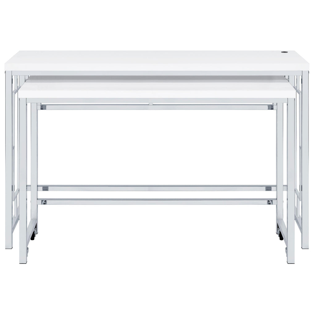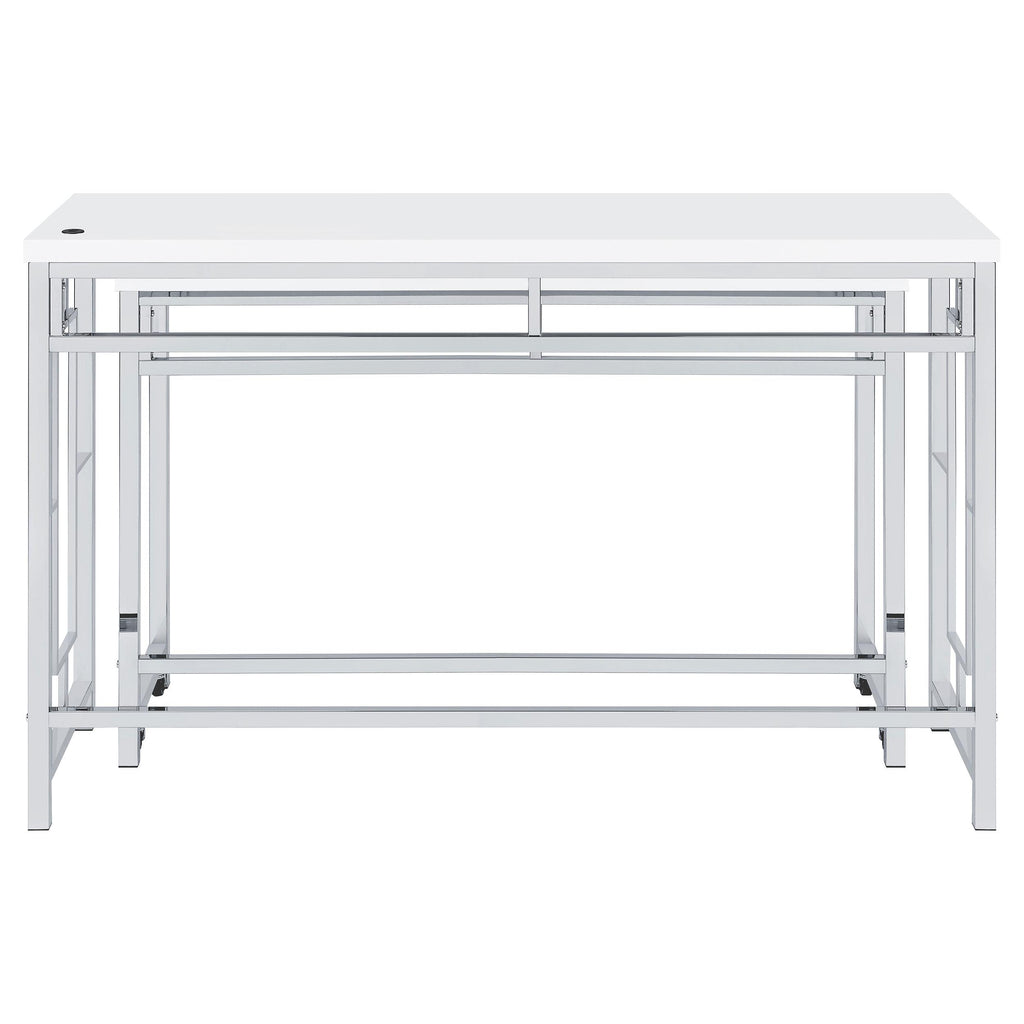 You'll fall in love with the versatility and impeccable styling of a contemporary four-piece counter height dining table set that... You'll fall in love with the versatility and impeccable styling of a contemporary four-piece counter height dining table set that includes two nesting tables and two backless stools. Whether you're dining or working from home, the set is designed to impress, with a larger table and a smaller table on wheels that tucks underneath, creates a waterfall effect, or can be positioned in an L-shape for working from home. Its crisp white and silver finish combination highlights artistic design. The set is complete with open sides and stool bases accentuated with floating frames to bring Deco character. The large tabletop is equipped with a USB port perfect for your phone. View more