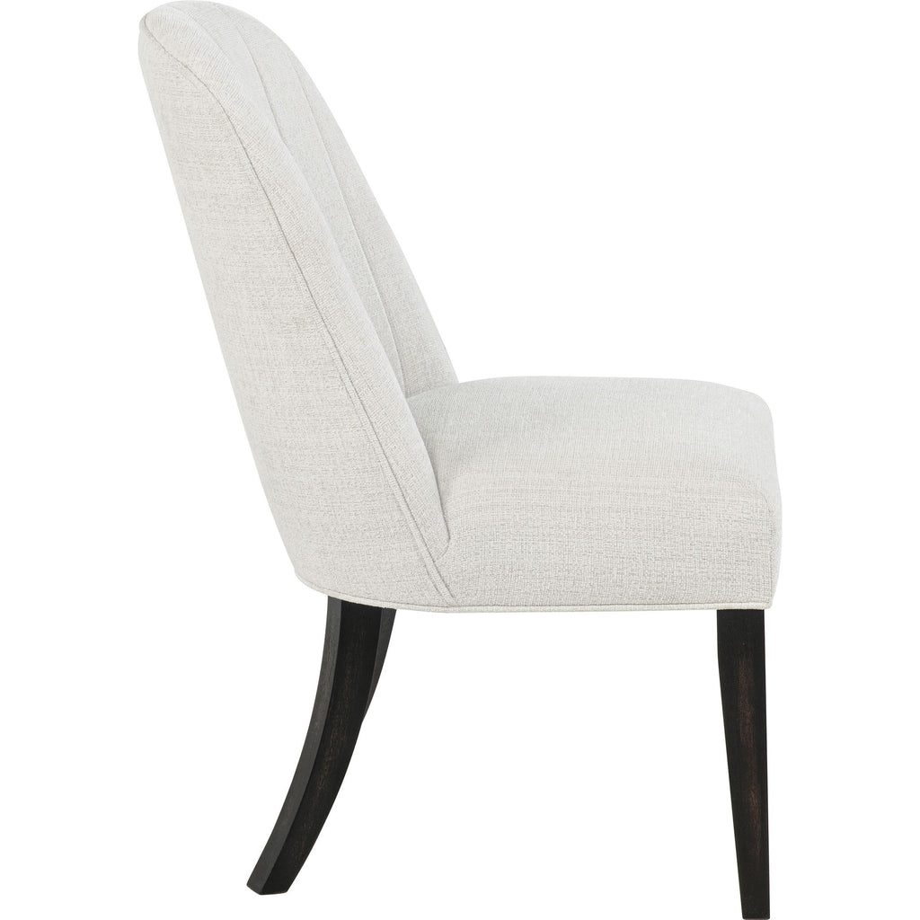 • Dining side chair wrapped in cream fabric with subtle channel tufting along the back