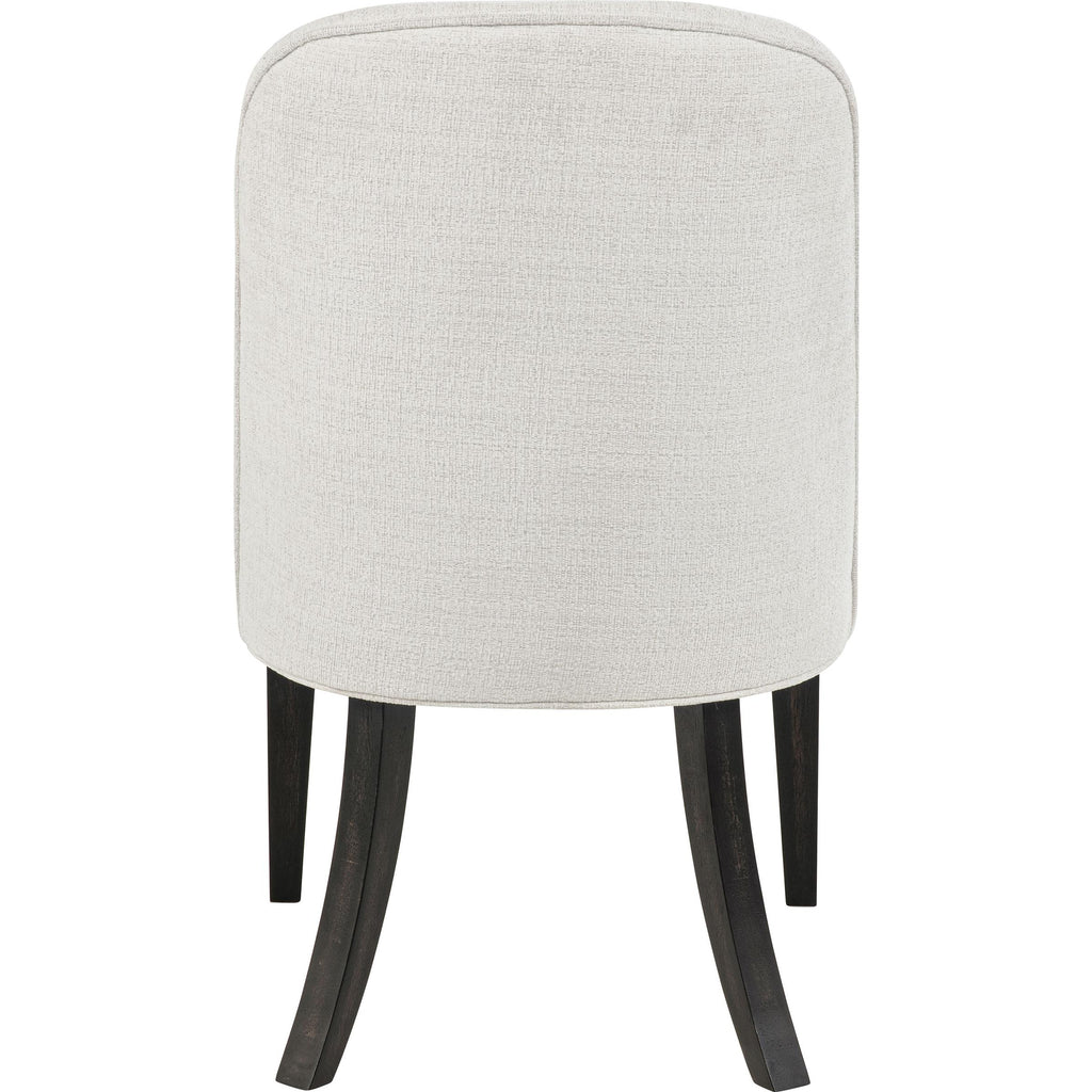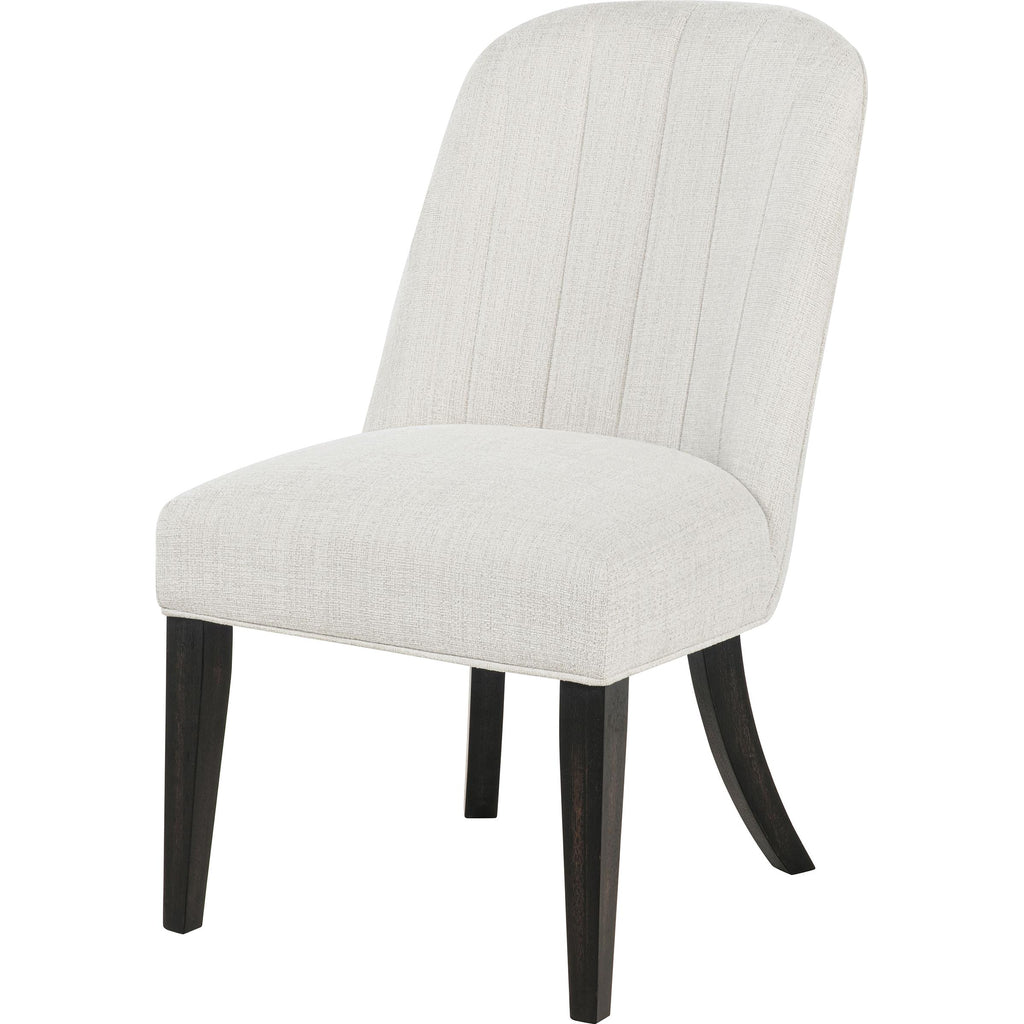 Graceful by design and soothing in tone, this upholstered dining chair invites lingering with every curve. Draped in creamy fabric,... Graceful by design and soothing in tone, this upholstered dining chair invites lingering with every curve. Draped in creamy fabric, its gently channeled backrest rises in soft vertical lines, embracing you in subtle elegance. Burnished black legs flare with sculptural ease, grounding the silhouette in warm contrast. From candlelit dinners to quiet morning coffees, this chair offers a seat not just at the table, but at the heart of the home. View more