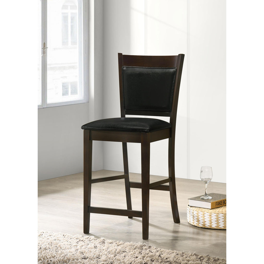 • Streamlined counter stools feature black leatherette upholstery on seat and back cushions