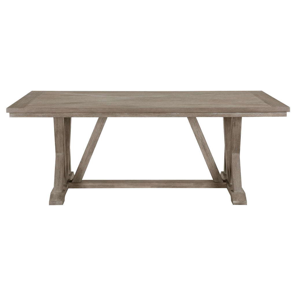 • Approachable modern farmhouse style infuses a rectangular wood dining table