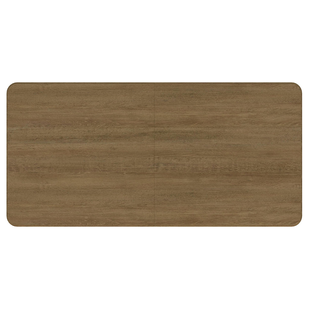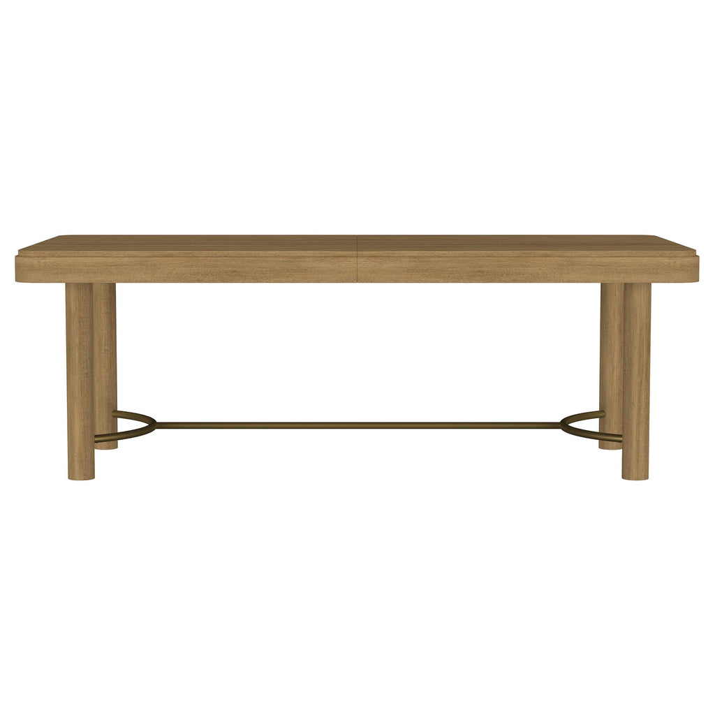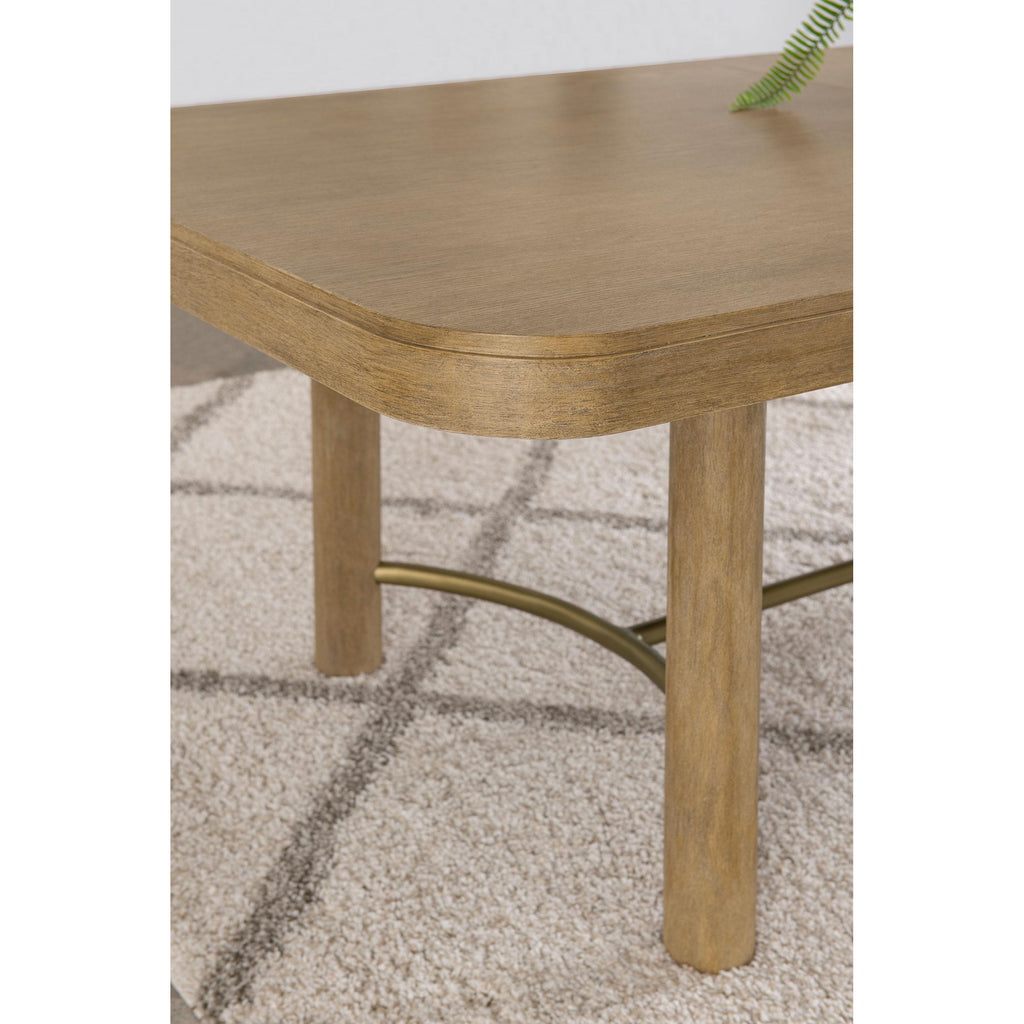 • Dining table with rounded corners and a sleek trestle base in a sand wash finish