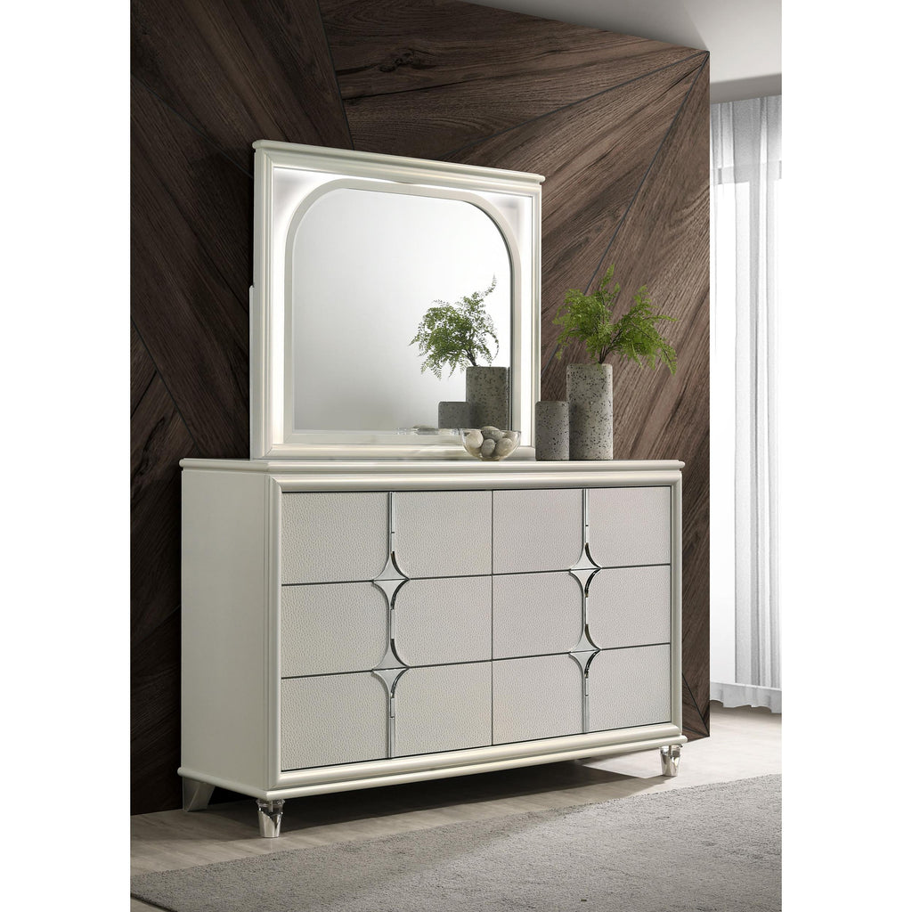 • Elegant 6-drawer dresser and mirror set in pearl white finish