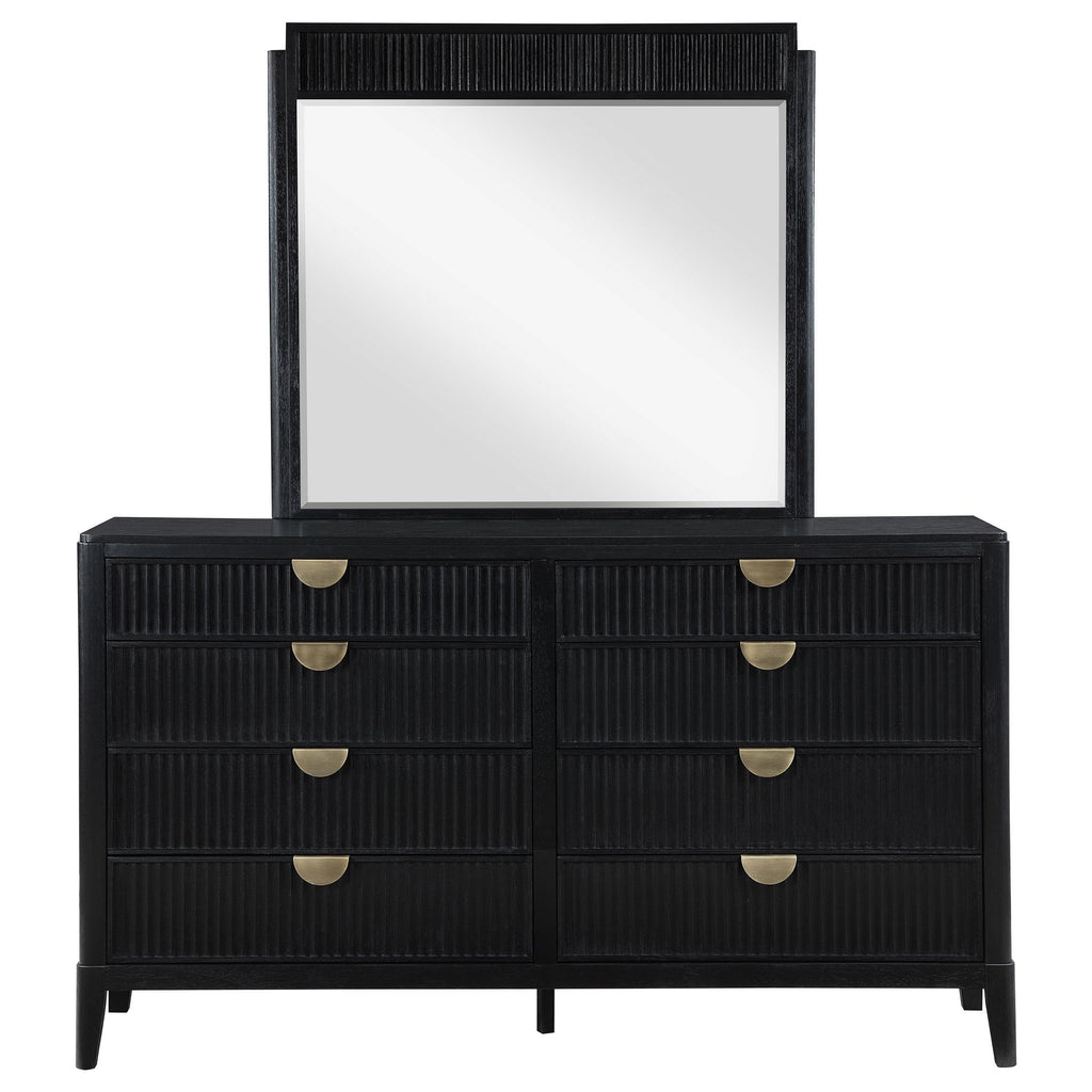 • Chic fluting adds depth and dimension to a modern eight-drawer dresser and mirror