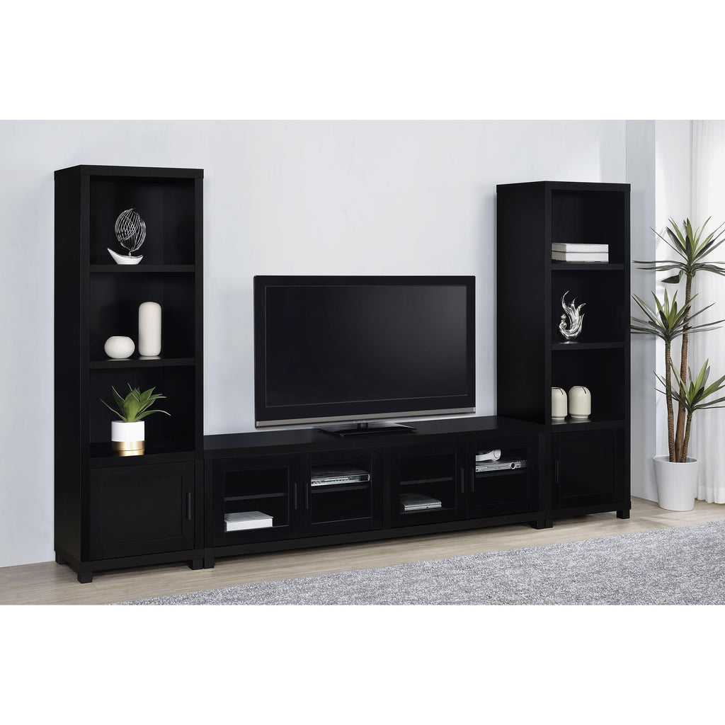 • Media towers feature three open shelves and a single-door cabinet for versatile storage