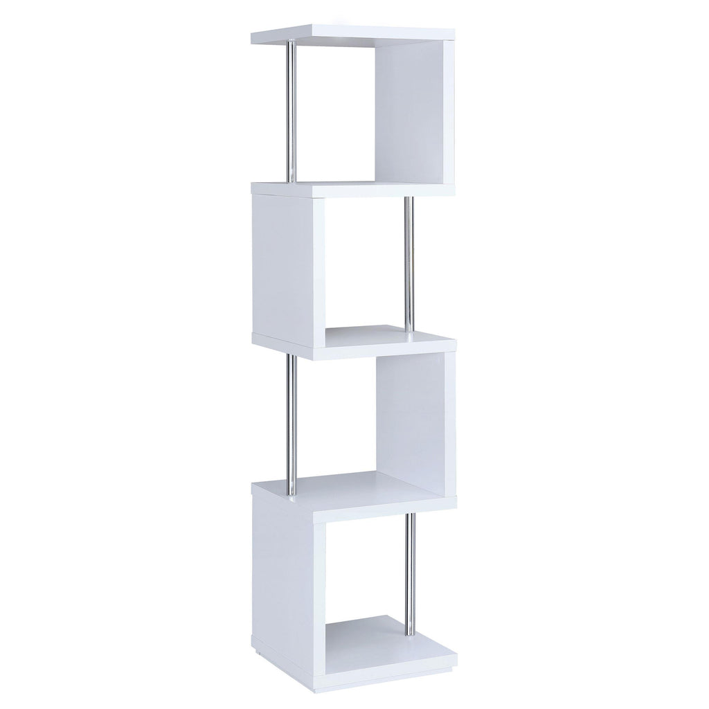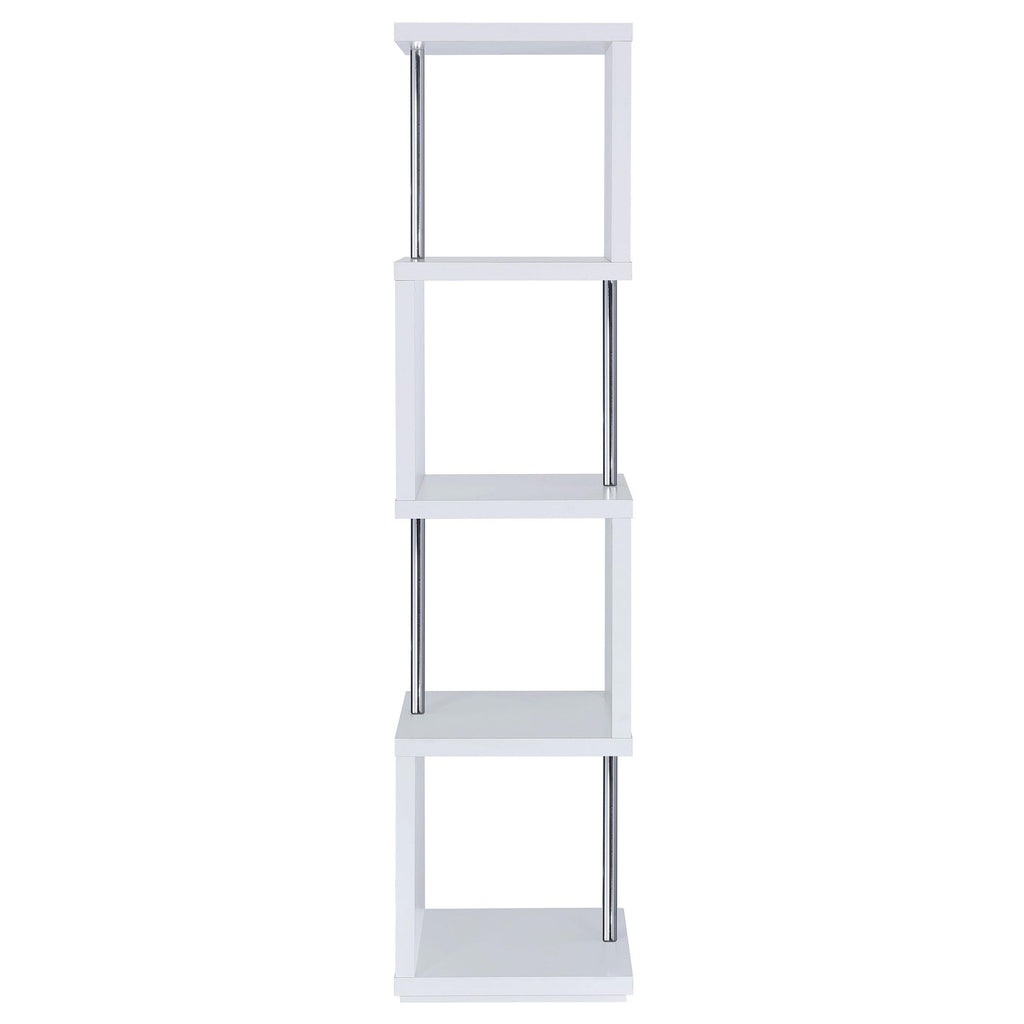 • Modern bookcase with four (4) tiers of shelving and electroplated chrome metal details