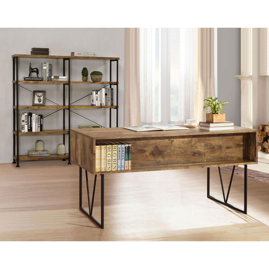 • Rustic industrial bookcase in rustic oak with black metal frame boasts clean lines for your modern decor
