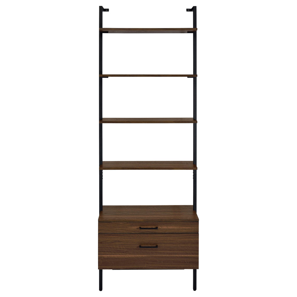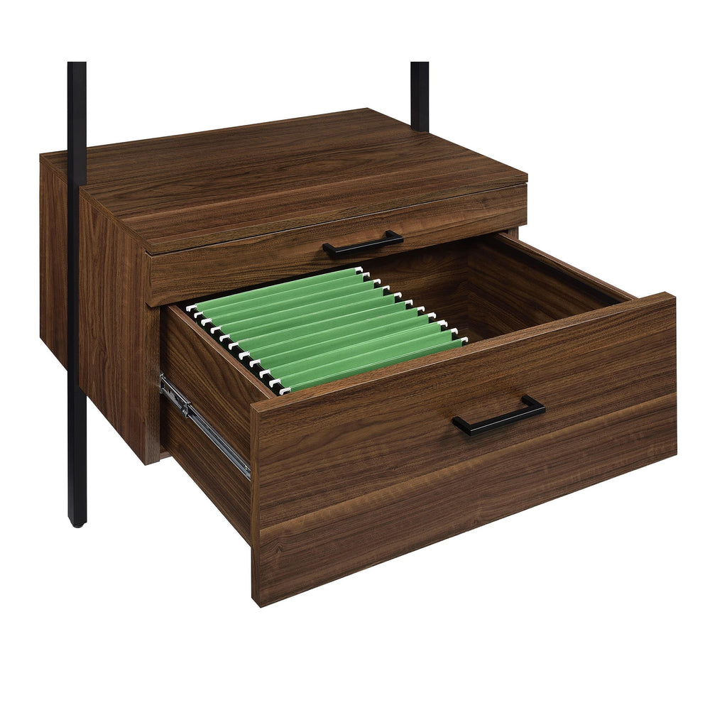• Shelves and drawers feature a deep walnut wood finish over melamine paper that's durable and stylish