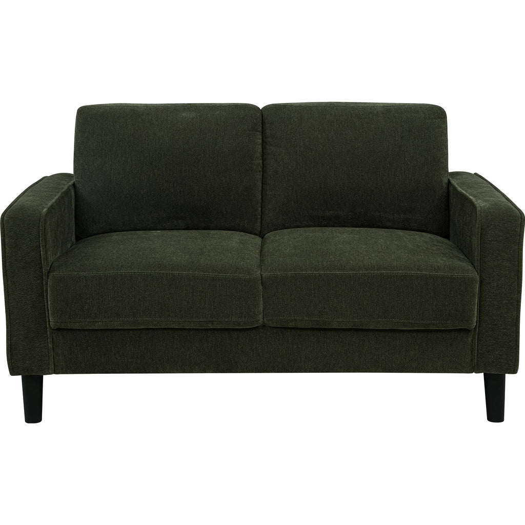 • Loveseat in matcha green fabric offers a compact two-seat design with clean structure