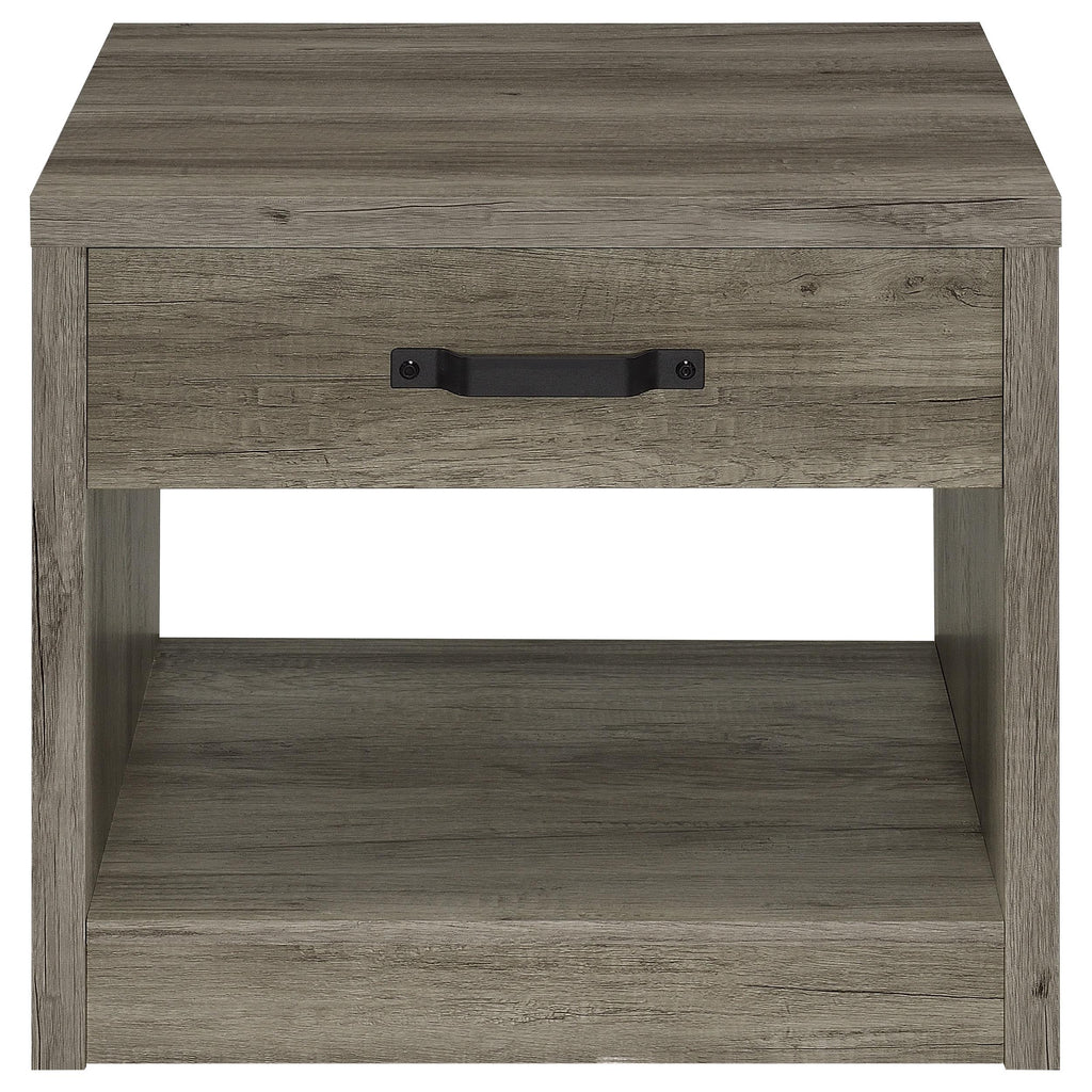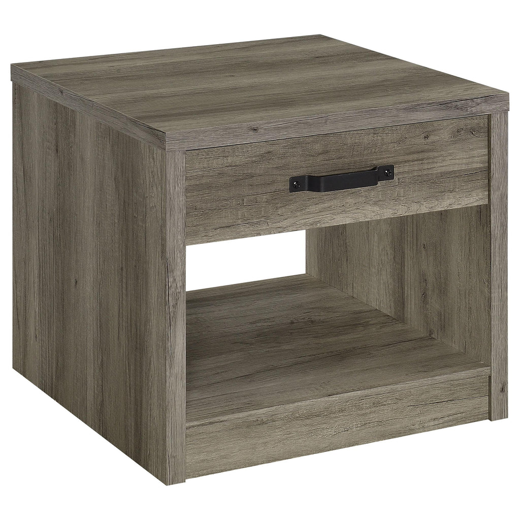 • Rustic end table with a stylish gray wood-look finish that enhances its natural charm