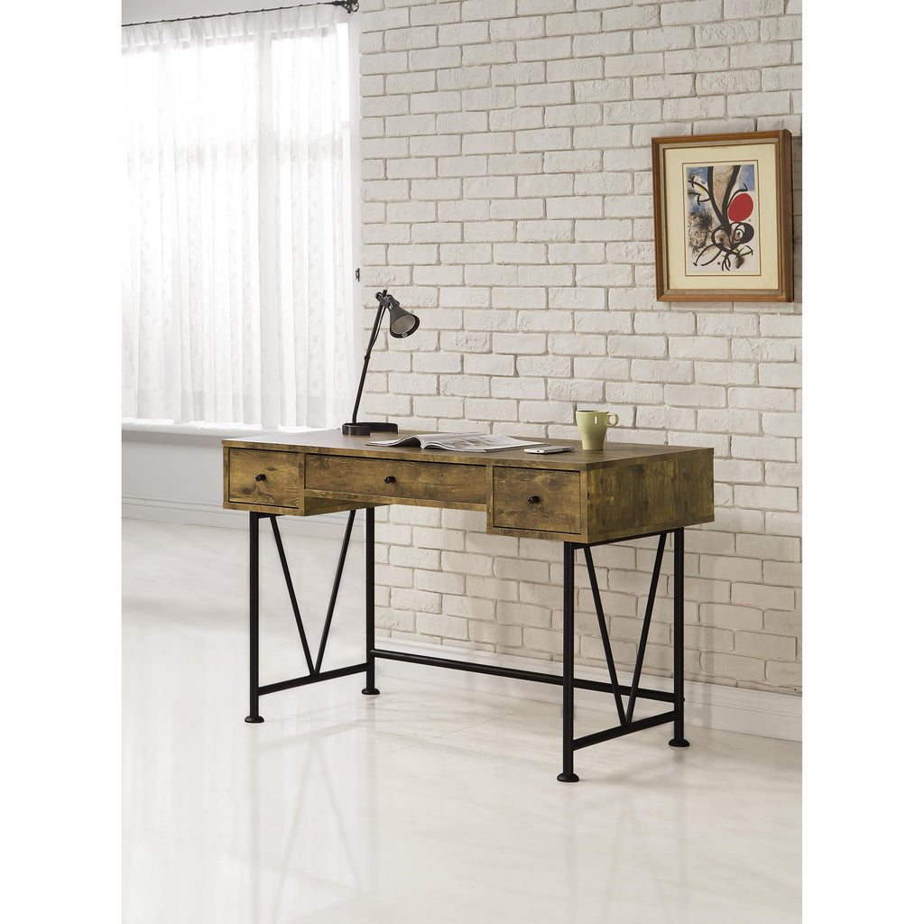 • Antique nutmeg finish with sturdy metal framework details makes this desk a topic of discussion