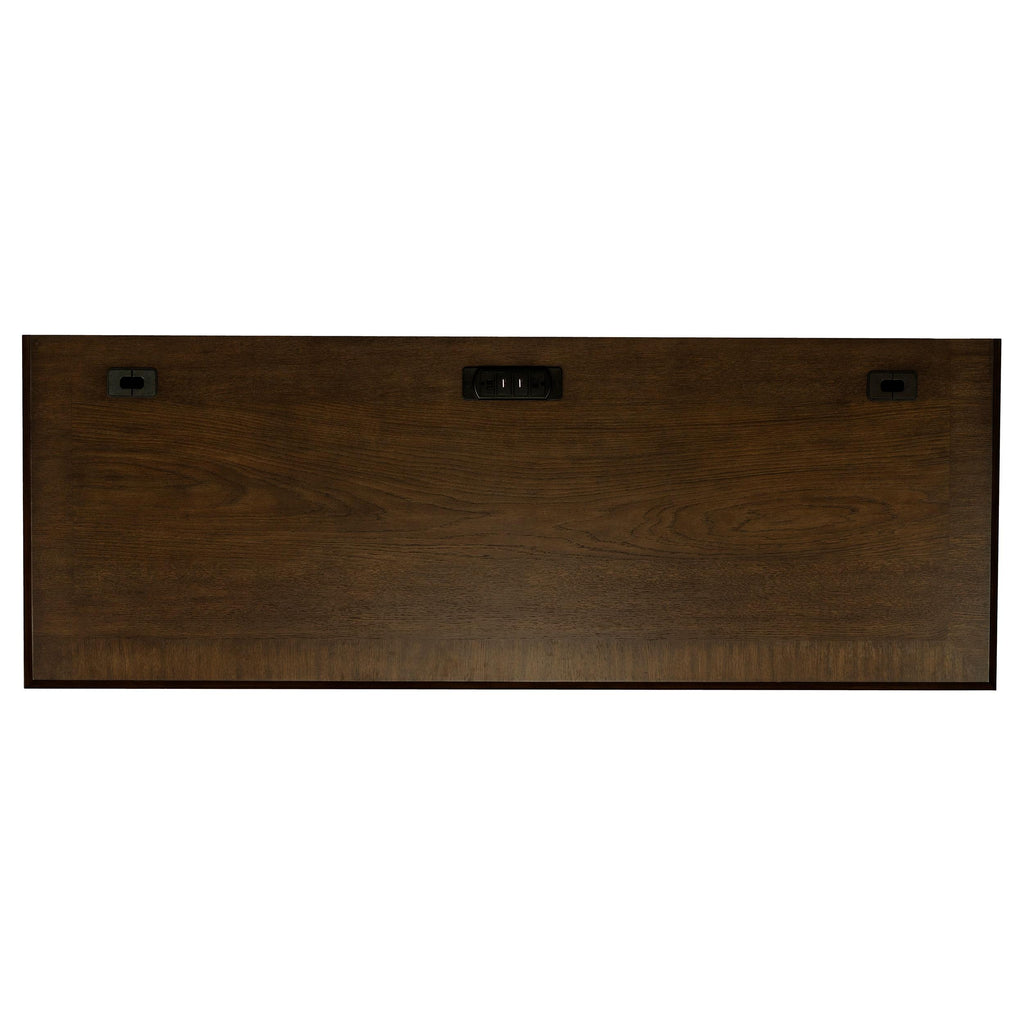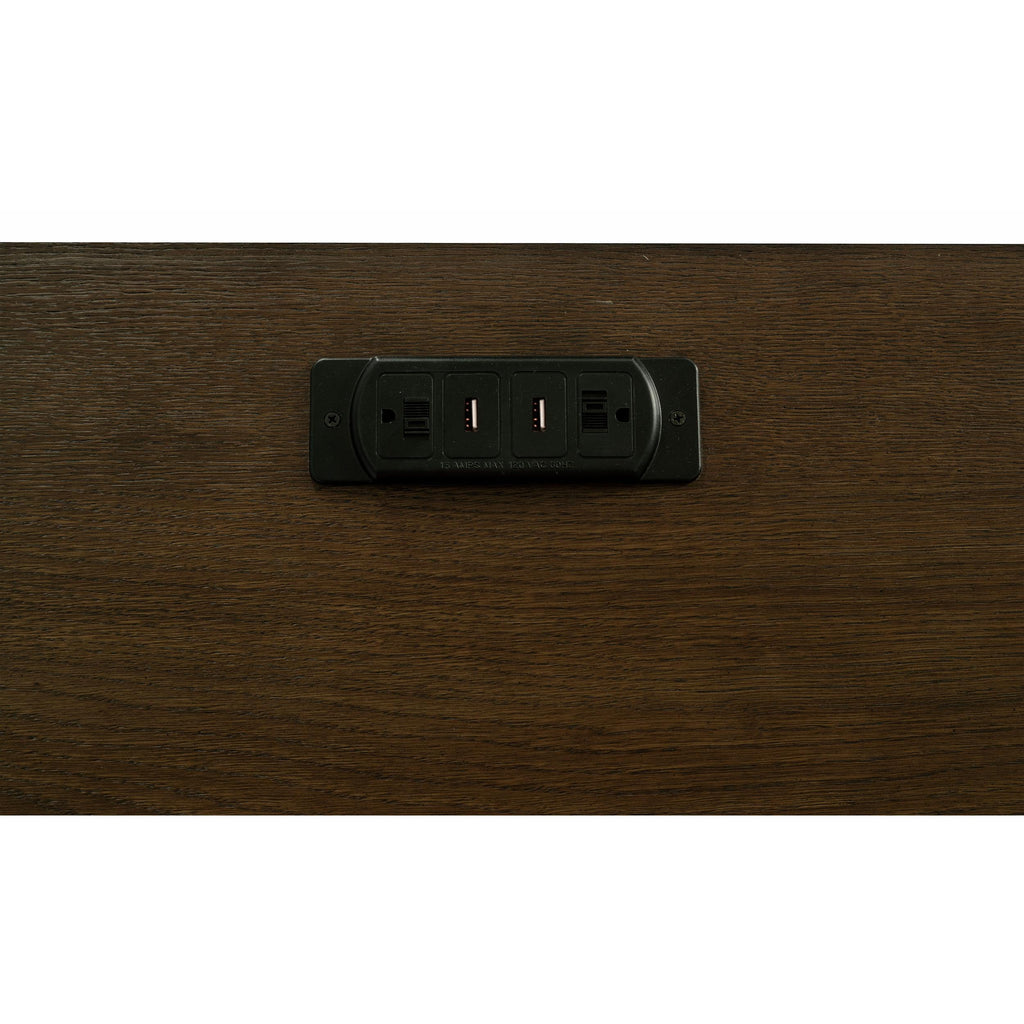 • Credenza includes a power outlet (2AC/2USB), center keyboard drawer, two top drawers and middle drawer with removable dividers, one lockable file cabinet, and a cabinet with an adjustable shelf