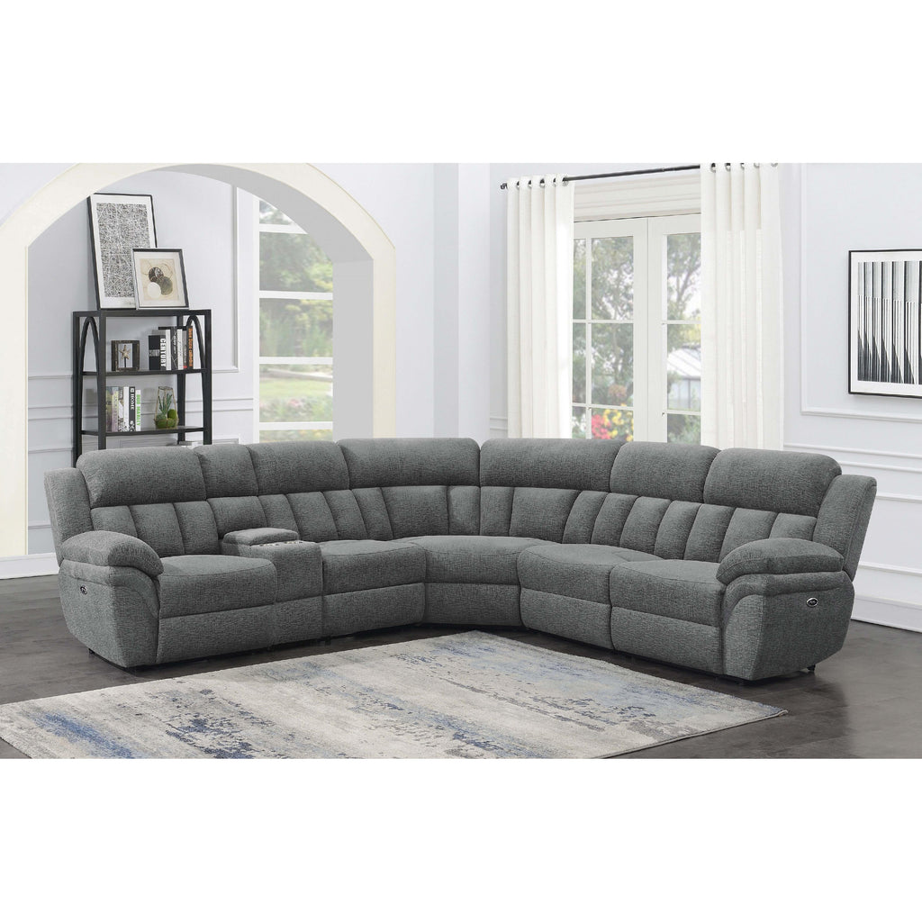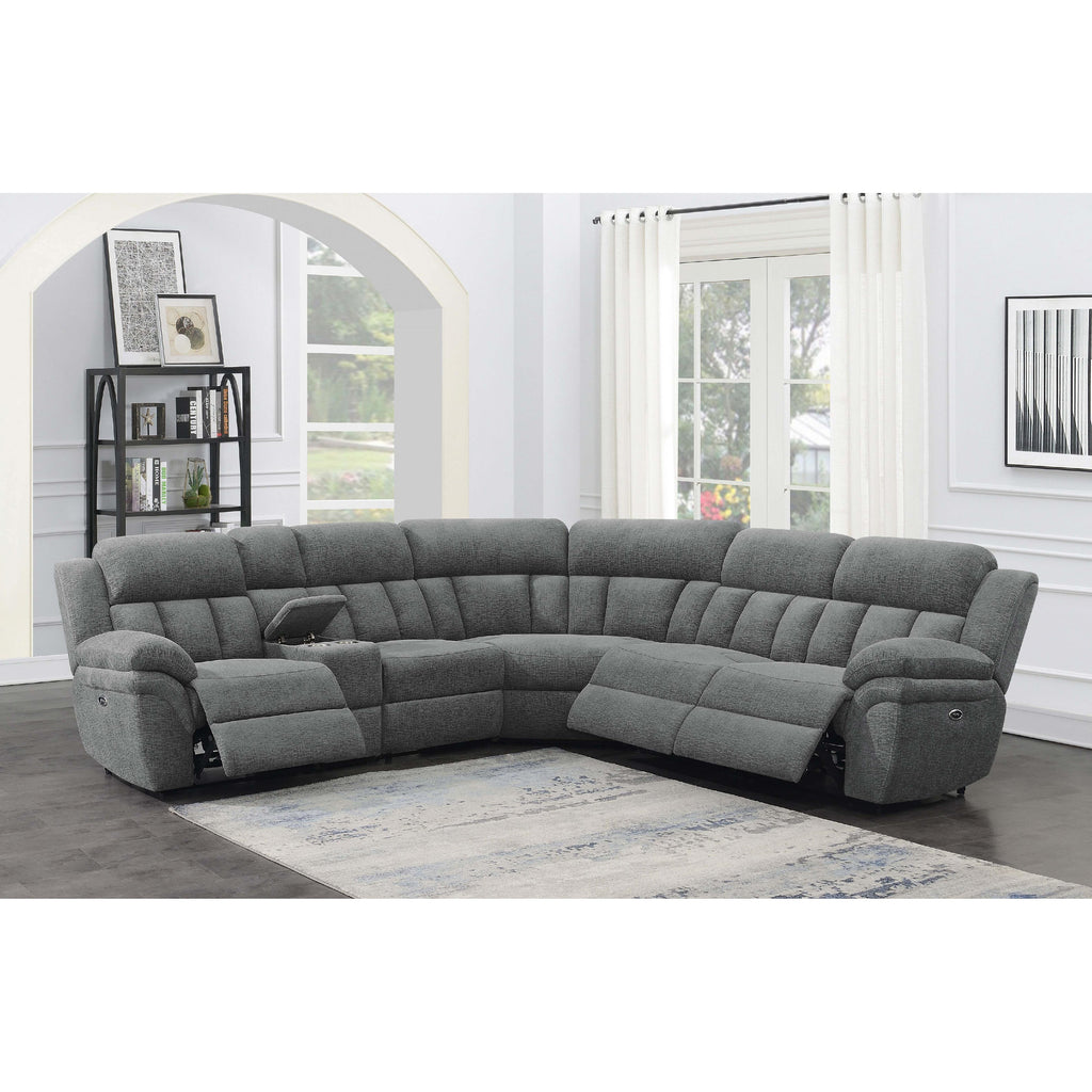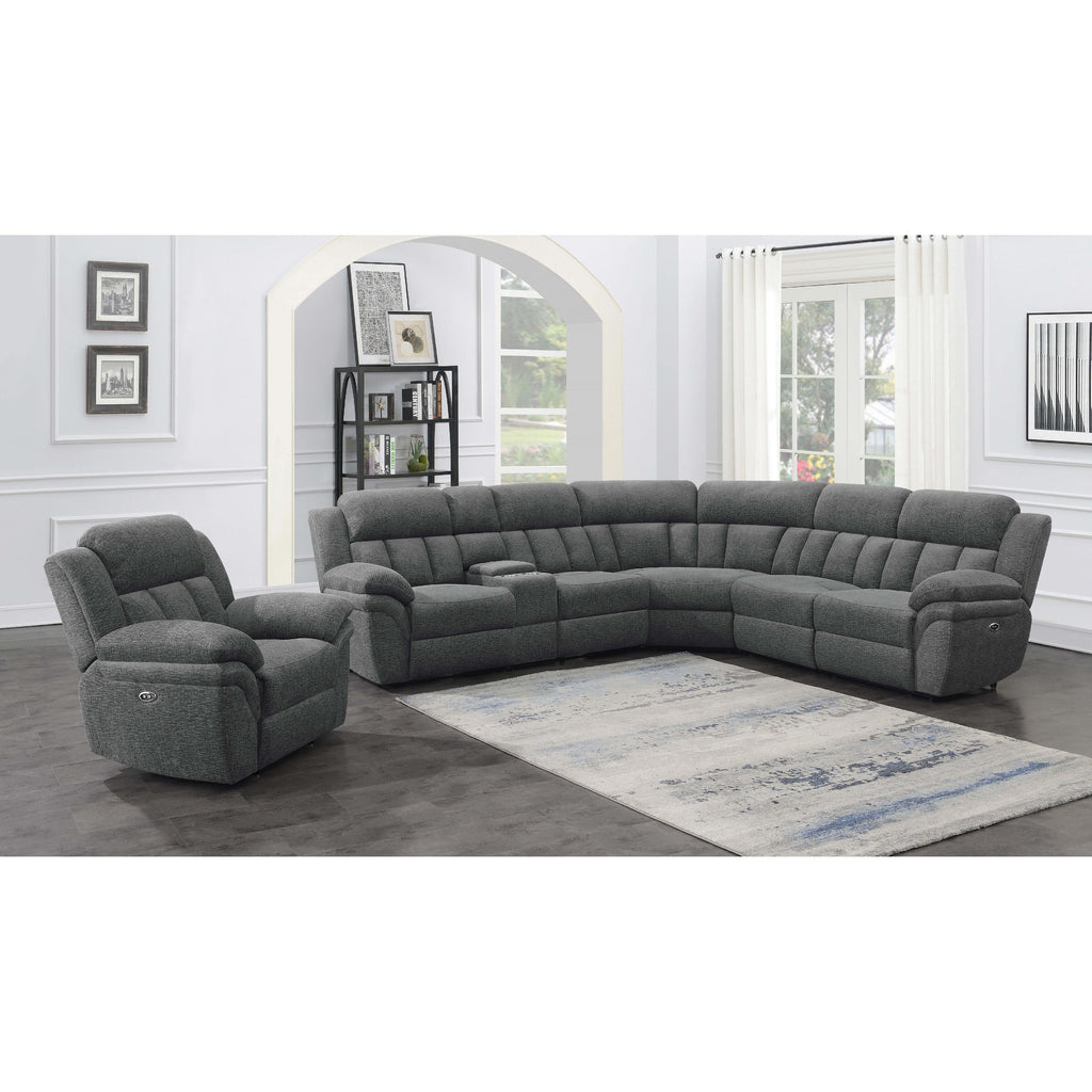 • Six-piece modular power sectional upholstered in charcoal performance chenille