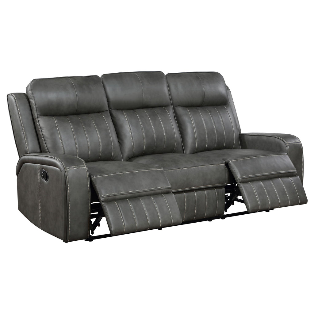 • Trending grey leatherette upholstery with decorative topstitching adds easy-care and maintenance