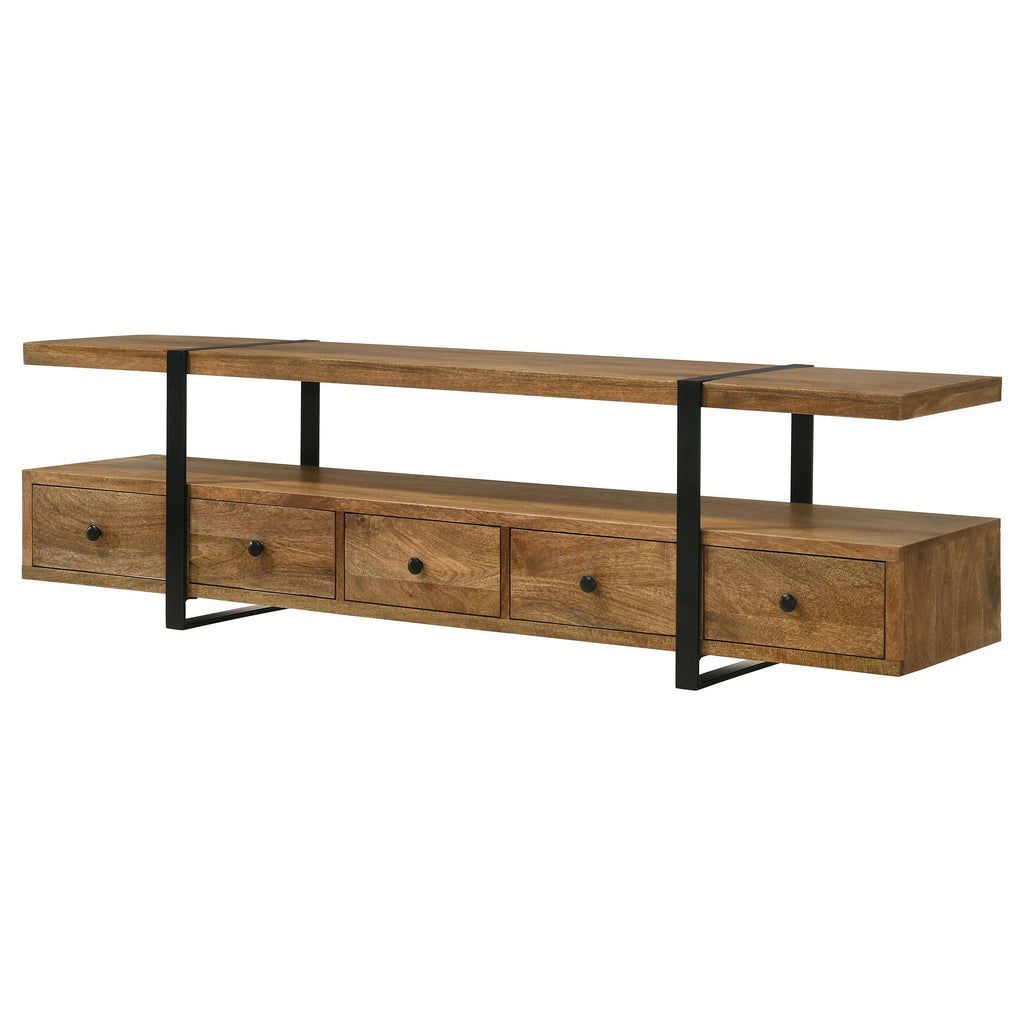 • Features a distinctive floating shelf, supported by sleek gunmetal-finished legs