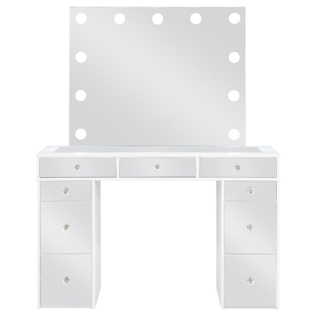 Pull out all the stops to set up a stylish and functional space for your makeup and prep, adding this... Pull out all the stops to set up a stylish and functional space for your makeup and prep, adding this three-piece white finish vanity set to a modern bedroom. Wood products construction with mirrored drawer fronts and a gray upholstered stool cushion team up to maintain an easy palette with versatility. Find space in nine drawers to stash implements, cosmetics, and accessories. Charming crystal knobs and a felt-lined top drawer add to a list of fab features. The marquee element of this set is a mirror surrounded with bulbs to offer helpful lighting as it enhances a chic design. View more
