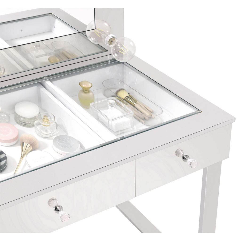 • This vanity set includes a table, mirror, and stool