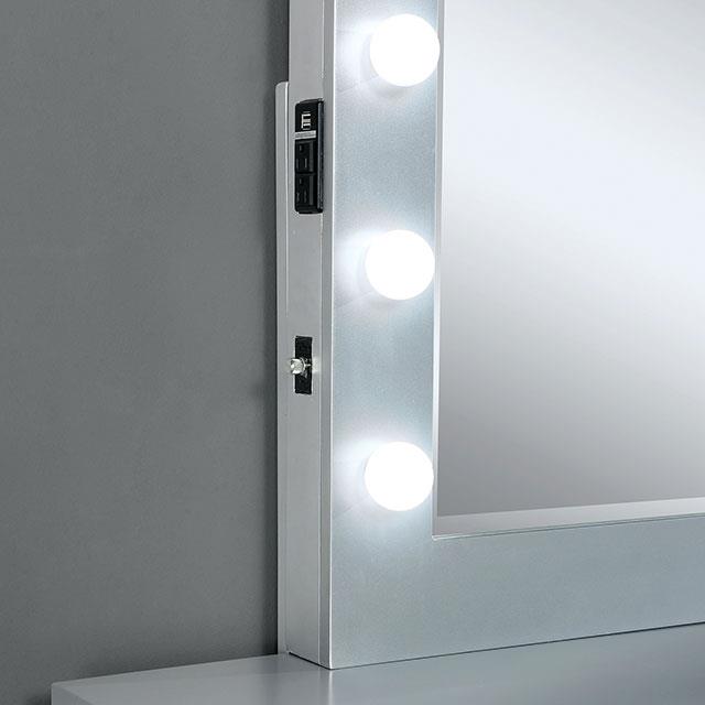 Simple in silhouette but oozing with personality, this bright white vanity table will induce a sense of class to any... Simple in silhouette but oozing with personality, this bright white vanity table will induce a sense of class to any bedroom space. Lining up the central mirror are 11 bright bulbs, controlled by a switch on the right edge of the mirror. This also houses the USB and power outlet to charge your phone, tablet, or power your beauty tools. The table top is clear glass, so each tool is easy to spot and retrieve, and multiple storage are within arm's reach. Of course, what's a vanity without a soft, fabric stool to sit on while you manage you prepare for a glorious evening ahead? View more