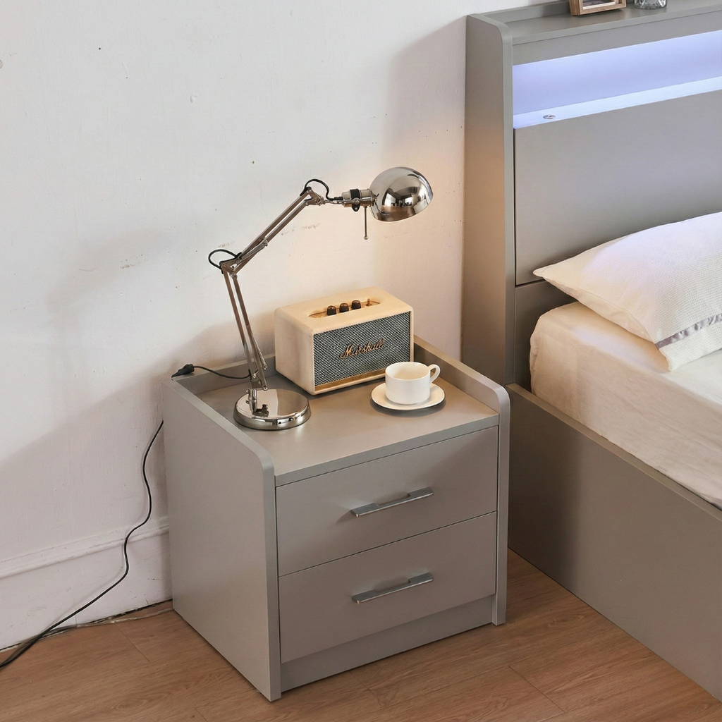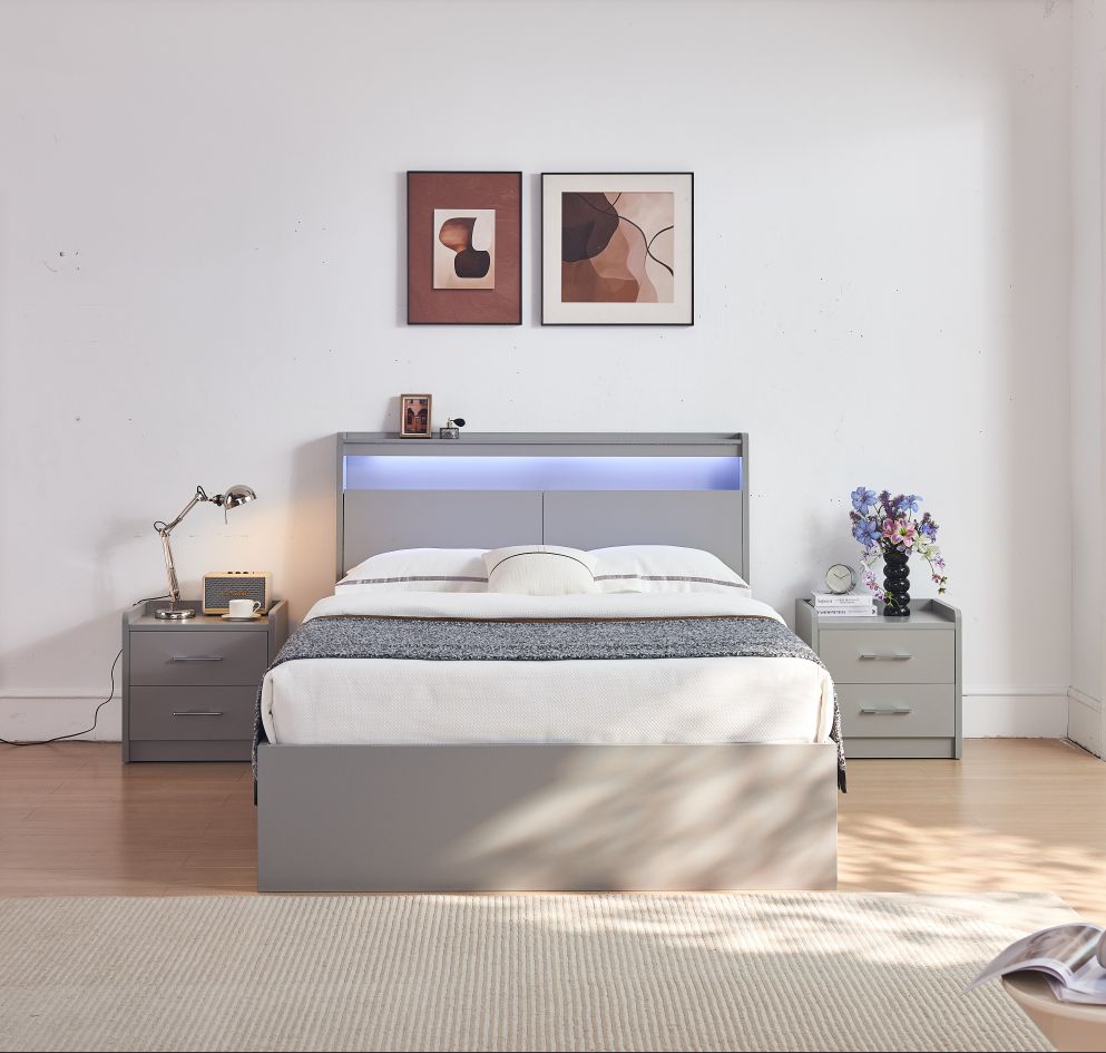 Upgrade your bedroom with this sleek, contemporary bed set designed for both style and functionality. Finished in a premium high-gloss... Upgrade your bedroom with this sleek, contemporary bed set designed for both style and functionality. Finished in a premium high-gloss grey lacquer, this set delivers a clean, modern aesthetic that elevates any space. The bed features a lift-top hydraulic storage system, offering generous hidden storage that’s smooth and easy to access—perfect for bedding, blankets, and seasonal essentials. The headboard includes built-in storage for added convenience, keeping everyday items neatly within reach. Integrated LED lighting along the back of the headboard adds a soft, ambient glow, creating a relaxing atmosphere while enhancing the modern look. Completing the set, the dresser mirror comes with built-in lights, providing both practicality and a refined touch for daily use.   ADDITIONAL NIGHT STAND - 399$ Key Features: Premium high-gloss lacquer finish Elegant grey color Hydraulic lift-top storage for maximum space Storage in headboard for added functionality LED lights on the back of the headboard Lighted dresser mirror for a complete modern setup A perfect blend of smart storage, modern lighting, and luxurious finish—this bed set is designed to make your bedroom look organized, stylish, and effortlessly modern. View more