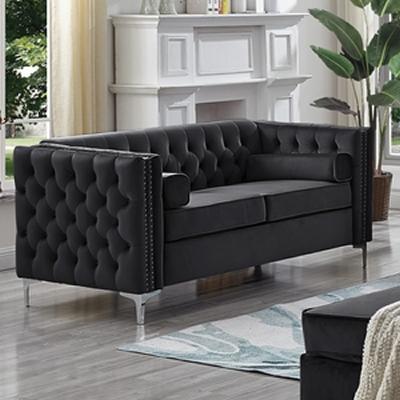 This loveseat from IFDC will make a great addition to your living room. It features deep tufting on the back... This loveseat from IFDC will make a great addition to your living room. It features deep tufting on the back cushion and outsides, track arms, nailhead details, and chrome legs. It comes in black fabric. View more