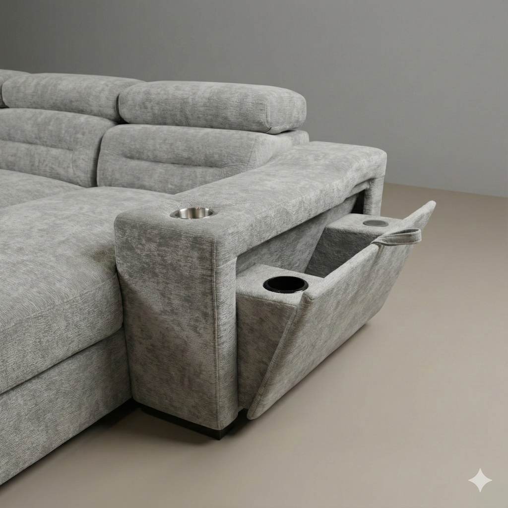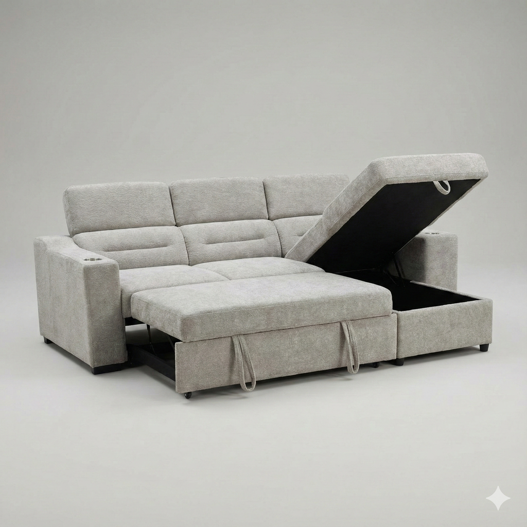 Experience versatility, comfort, and smart functionality in one refined design. This premium sectional sofa features a smooth pull-out bed, making... Experience versatility, comfort, and smart functionality in one refined design. This premium sectional sofa features a smooth pull-out bed, making it ideal for overnight guests without compromising everyday style. Built-in cupholders on both sides add convenience, while integrated wireless charging keeps your devices powered and within reach. The chaise includes spacious hidden storage, perfect for blankets, pillows, or everyday essentials, helping you maintain a clean and organized living space. Upholstered in a premium, easy-to-clean performance fabric, this sectional is designed for durability, low maintenance, and long-lasting comfort. View more