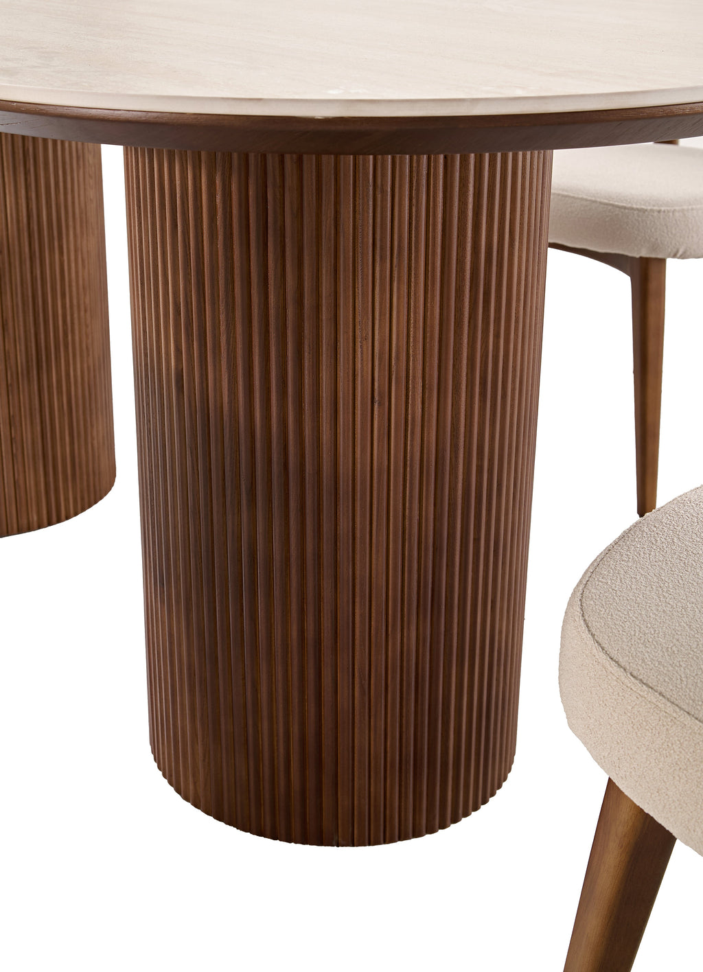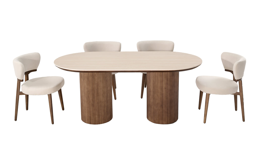 Elevate your dining space with this refined 79-inch dining set, designed to balance modern elegance with everyday comfort. The spacious... Elevate your dining space with this refined 79-inch dining set, designed to balance modern elegance with everyday comfort. The spacious stone tabletop in a warm wheat finish offers a smooth, durable surface that’s perfect for both casual meals and entertaining. Supported by a sculptural wooden base, the table brings natural texture and stability with a contemporary edge. The accompanying chairs are upholstered in premium fabric and thoughtfully designed with a curved back for enhanced comfort and support. Their soft, inviting silhouette pairs beautifully with the warm wood tones, creating a cohesive and welcoming dining experience. Features: 79" stone top table with elegant wheat finish Solid wooden base with a modern, architectural design Premium fabric dining chairs Ergonomic curved backs for added comfort and support Ideal for modern, contemporary, or transitional interiors View more