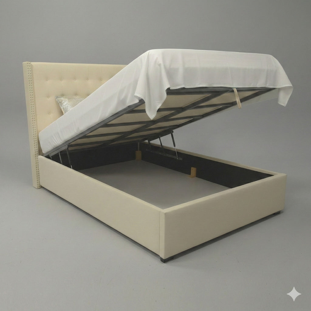 Maximize your bedroom space without compromising on style. This stunning Queen bed is wrapped in high-quality performance fabric, offering a... Maximize your bedroom space without compromising on style. This stunning Queen bed is wrapped in high-quality performance fabric, offering a soft, luxurious feel that is durable enough to withstand daily wear and tear. The design features a sophisticated tall headboard with classic button tufting and elegant nailhead trim on the wings, making it a perfect centerpiece for any modern or transitional bedroom. The true beauty of this bed lies in its functionality. Equipped with a smooth, easy-lift hydraulic mechanism, the mattress platform rises to reveal a spacious under-bed storage compartment. It is the ideal solution for storing seasonal clothing, extra bedding, suitcases, and pillows, keeping your room clutter-free. Key Highlights: Premium Upholstery: Soft, durable performance fabric that is easy to maintain. Hidden Storage: Full-sized under-bed compartment with gas-lift hydraulic mechanism. Elegant Design: Wingback headboard with deep button tufting and metallic nailhead accents. Sturdy Frame: Metal mattress support frame ensures longevity and stability. View more